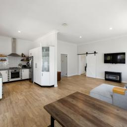 At the heart of the home, the open plan kitchen, dining and living area forms a natural hub for connection. French doors open to a private rear patio, creating an easy indoor outdoor flow that is ideal for entertaining or relaxed evenings at home. The low maintenance gardens ensure you can enjoy your weekends with minimal upkeep.