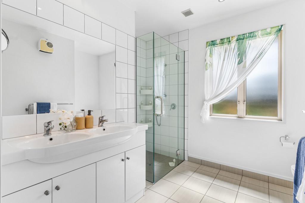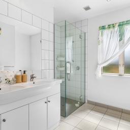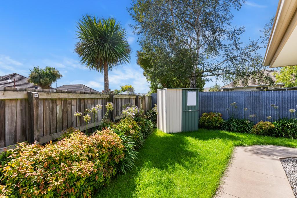 The home offers two comfortable bedrooms, including a master that captures lovely views of the greenery. These are serviced by a generous, modern bathroom featuring a double vanity and a glass-enclosed walk-in shower, specifically designed for both style and accessibility. A handy garden shed further ensures that everyday living remains organised and effortless.