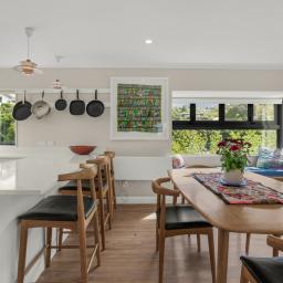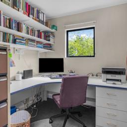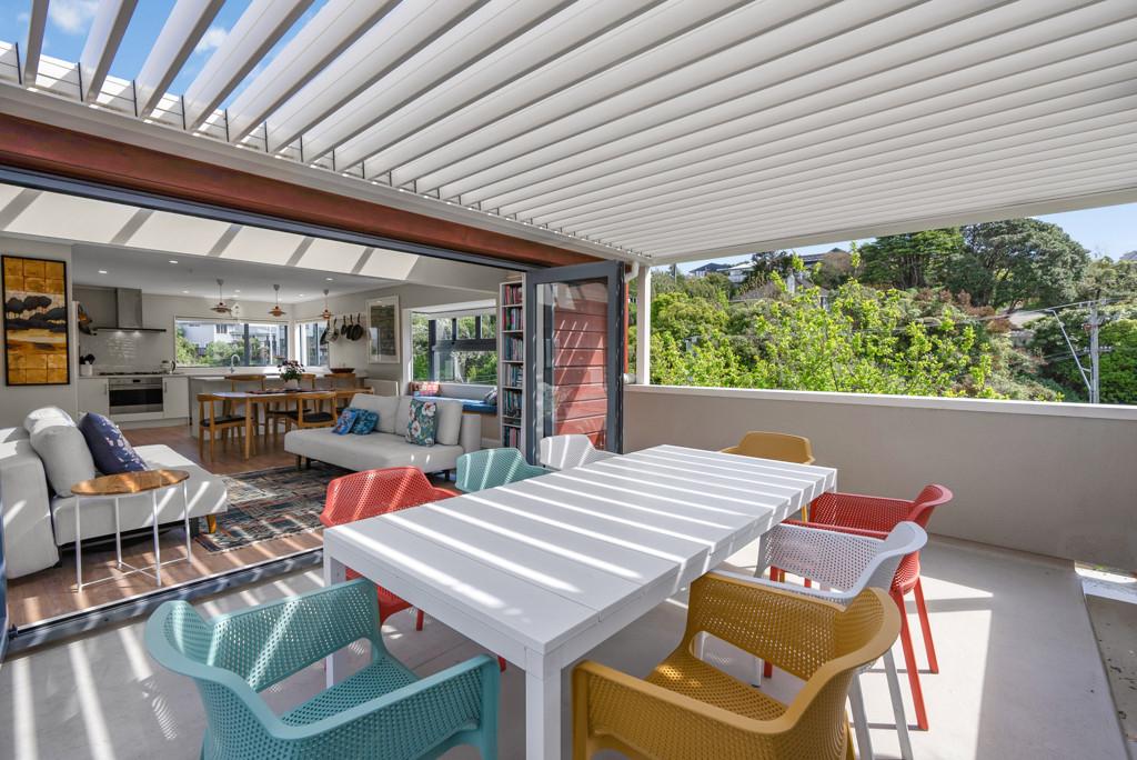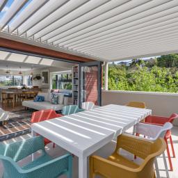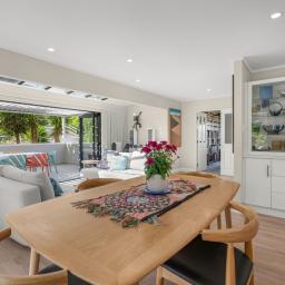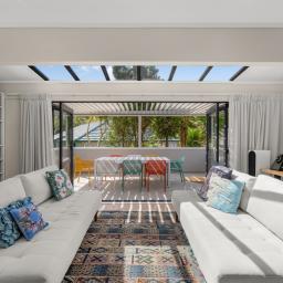 The kitchen is designed with entertainers in mind, seamlessly connecting to the family space and flowing effortlessly to a spacious deck. An electronic louvre system enhances the outdoor area, allowing for comfortable, year-round enjoyment regardless of the conditions.