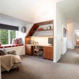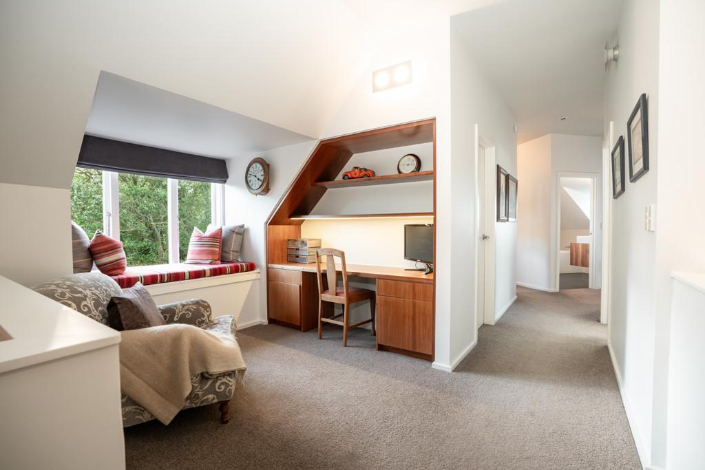 • An open-plan upper-level work-from-home zone with custom built-in workstation and window seat creates a practical yet inviting space for remote work.