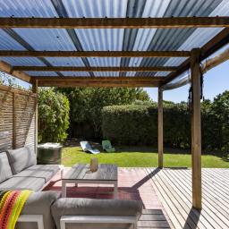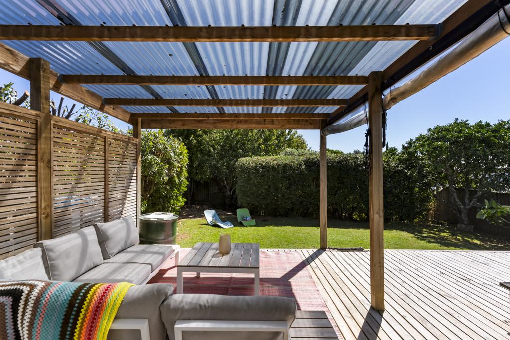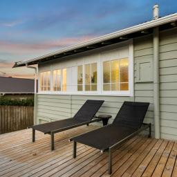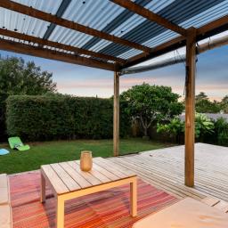 French doors extend the living space to a generous, west-facing rear deck. Sheltered for all weather enjoyment, this area captures the best of the afternoon and evening light. It overlooks a private lawn framed by mature hedges and palms - a fully fenced and sun-drenched sanctuary for pets, play, or alfresco entertaining.