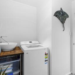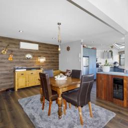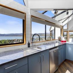 To the rear of the living space, a generous dining area sits alongside an impressive, oversized kitchen. Bathed in natural light from a wide expanse of windows and striking double-glazed triangular skylights, this kitchen is designed for hosting. Abundant storage and preparation space are enhanced by thoughtful extras, including an under-bench wine fridge – you’ll be ready for any occasion.