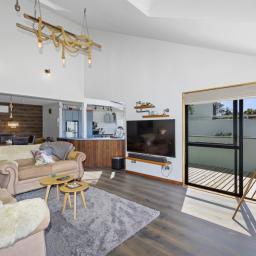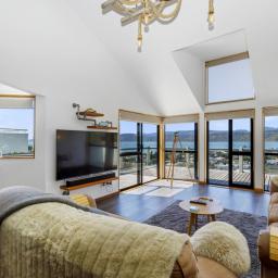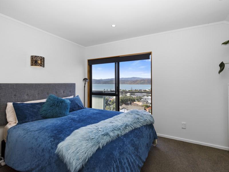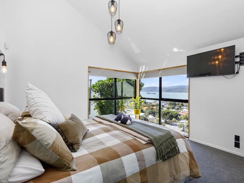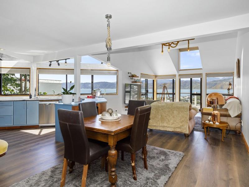 Commanding views unfold from every level, perfectly complemented by the home’s subtle nautical theme. The central living area is the star of the show, with magnificent elevated vistas across Seatoun, over the harbour to Eastbourne and out to Pencarrow Head. Step through to the expansive deck, cleverly sheltered from the wind, creating an idyllic space for entertaining or simply enjoying a quiet morning coffee while the harbour glistens below.