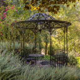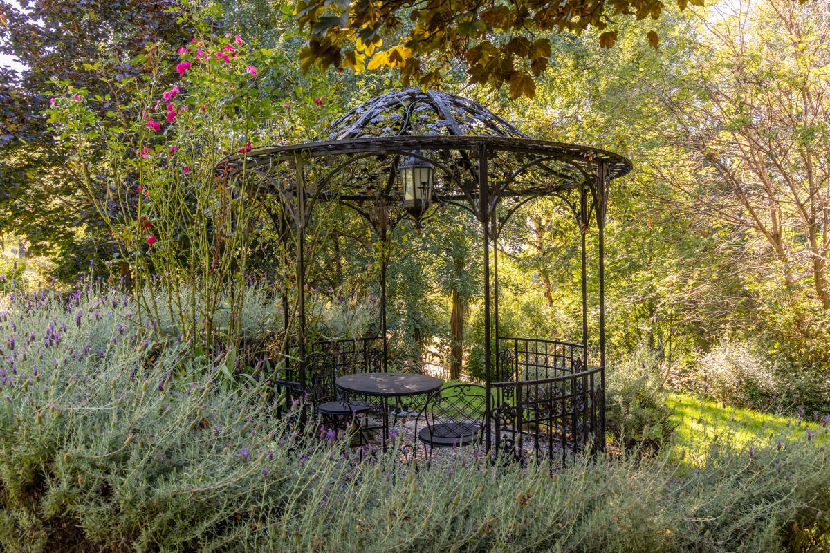 The two-acre parkland setting was originally planted more than twenty years ago and has been lovingly nurtured by previous owners who continued to develop and enhance the gardens. Today it features fabulous mature trees, a folly and wrought iron rotunda, a beautiful rose garden, two orchards, a greenhouse and an acre of larch forest.