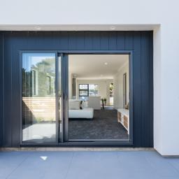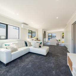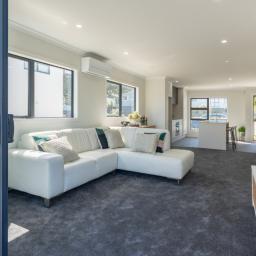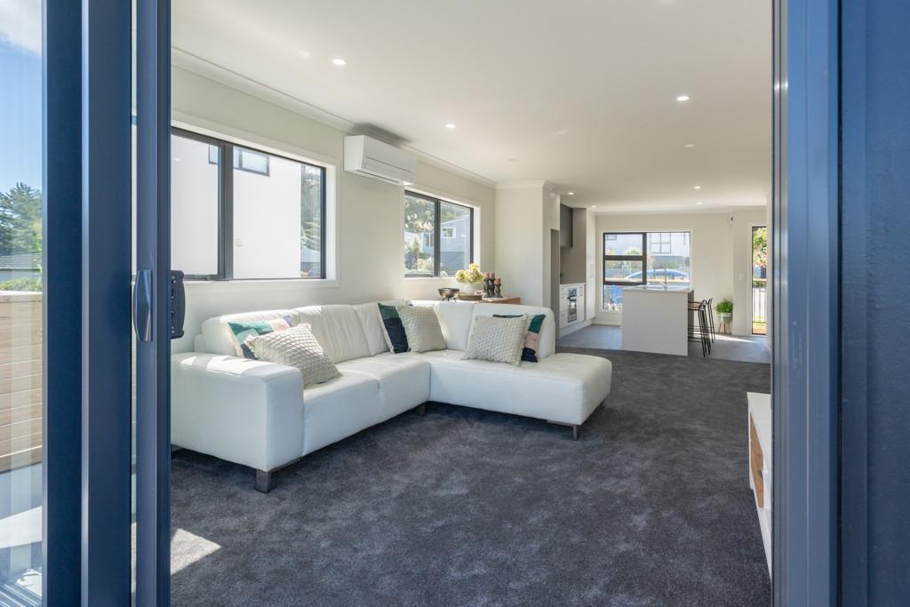 The open plan living room has a heat pump, and a NW aspect and opens to a sun drenched patio and easy care garden enjoying late, late sun.