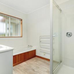 The primary bathroom is thoughtfully configured with a corner vanity, bath and shower, with a separate toilet for convenience.