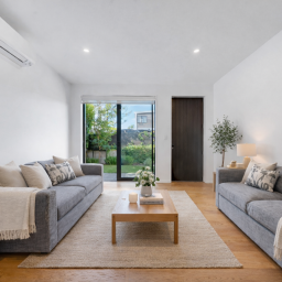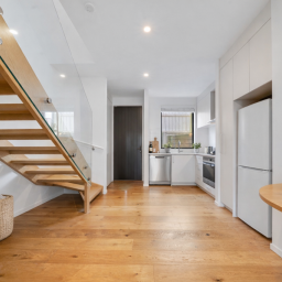 Inside, the property immediately impresses with a striking floating staircase with glass balustrade - a refined architectural centrepiece that elevates the space beyond the typical two-bedroom offering. Timber flooring, clean lines and generous natural light create a modern yet welcoming feel throughout.