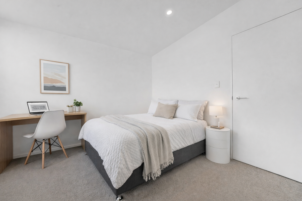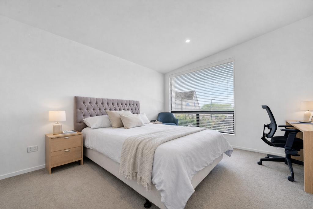 Upstairs, two well-proportioned bedrooms provide flexibility for couples, flatmates or a work-from-home configuration. The contemporary bathroom maintains the home's clean and cohesive aesthetic.