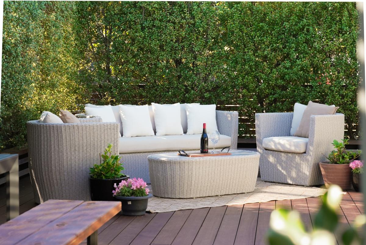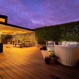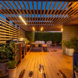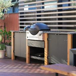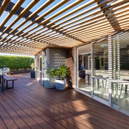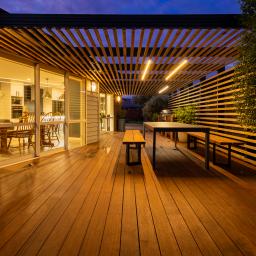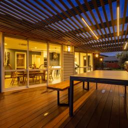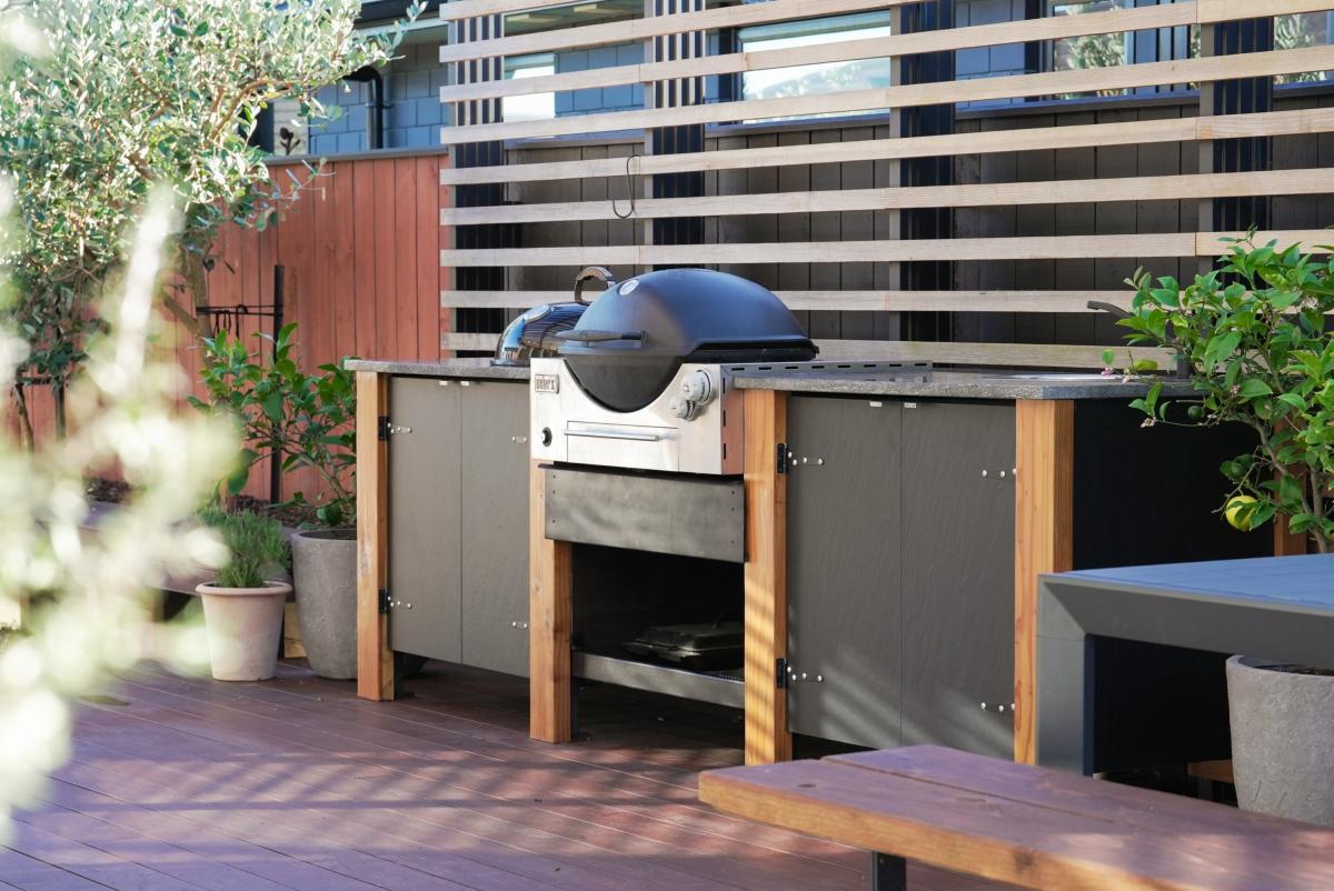 Sliding doors reveal an architecturally defined deck — partially framed by a timber pergola casting structured shadow lines. Integrated cabinetry accommodates gas and charcoal cooking options, complemented by a stone preparation bench and inset basin. Mature hedging encloses the boundary, creating remarkable privacy.