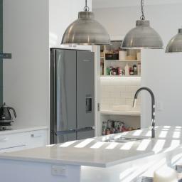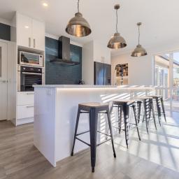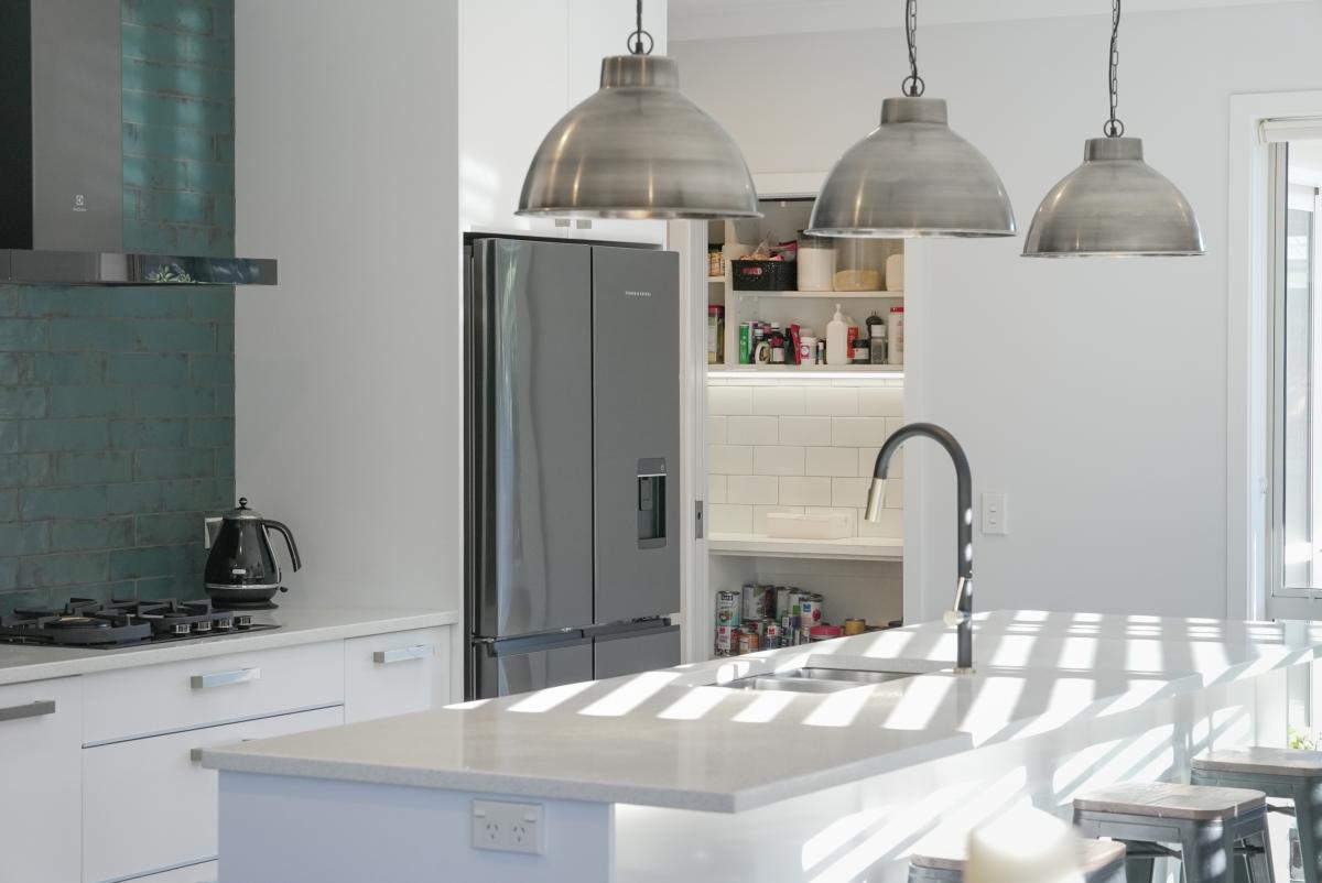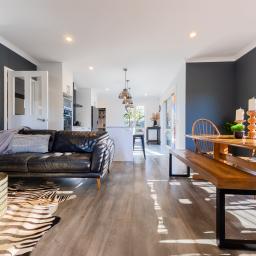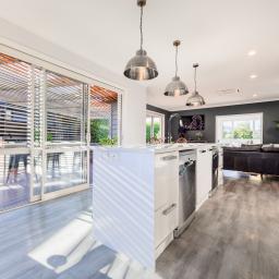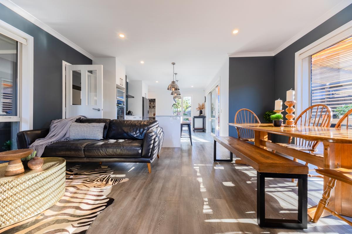 A tiled approach and sheltered brick entry introduce material depth from the outset. Inside, a central hallway anchors the home before opening into the kitchen, dining, and family zone. Composite timber-look flooring grounds the space, while a contemporary island and generous walk-in pantry support both everyday life and entertaining.