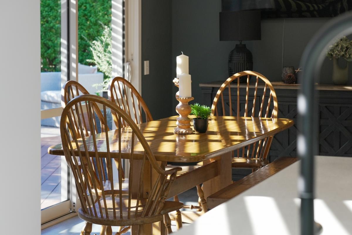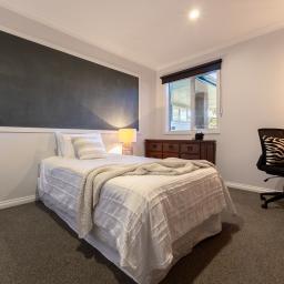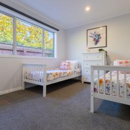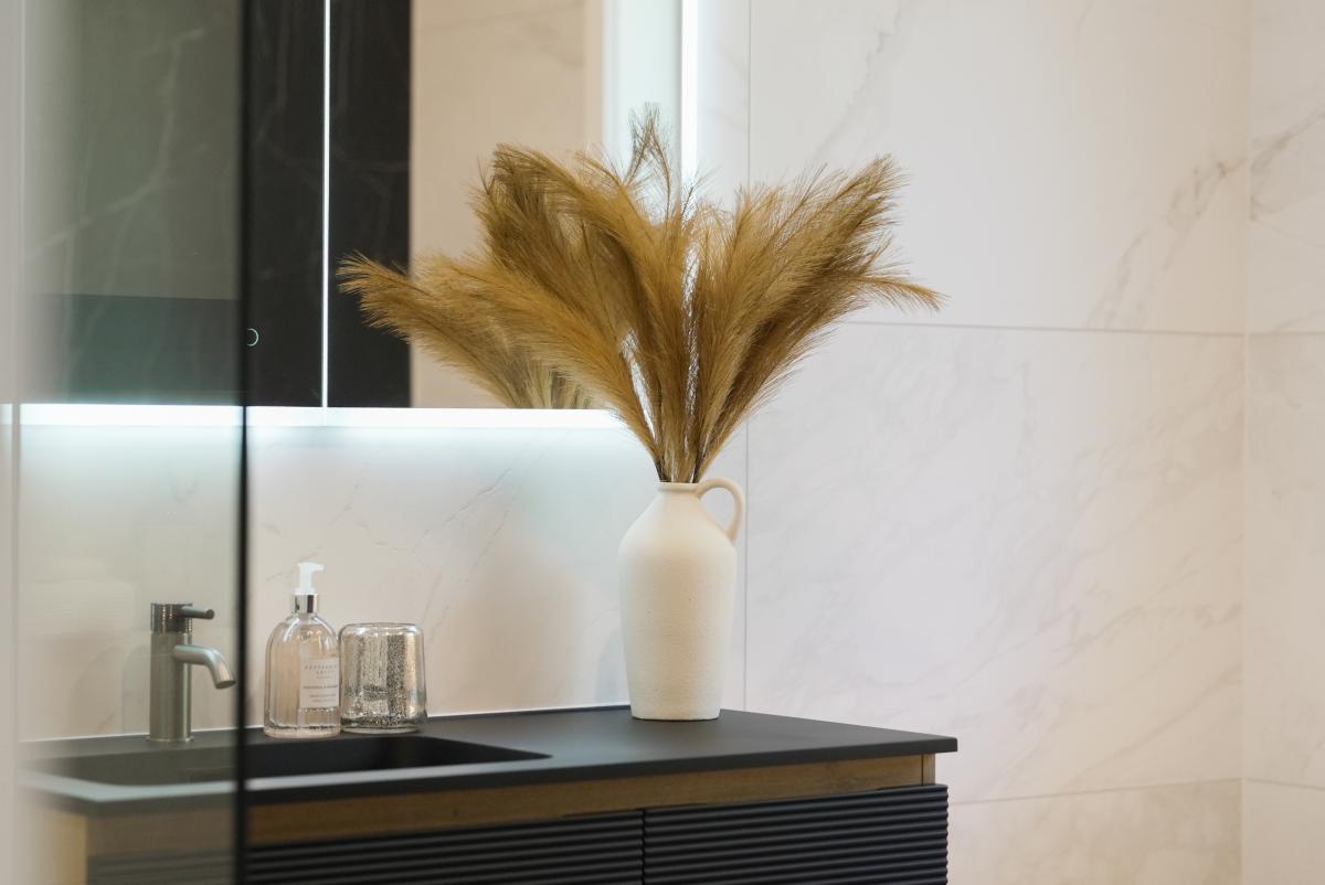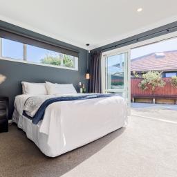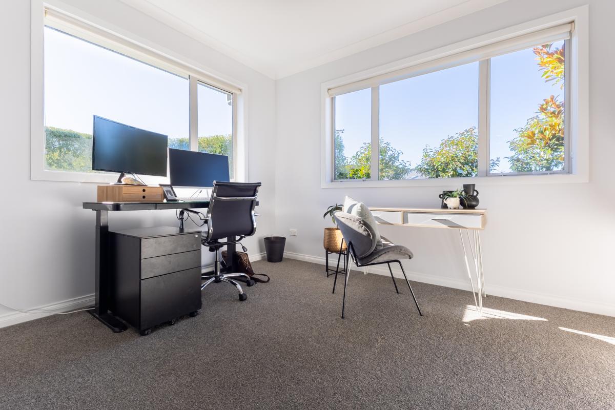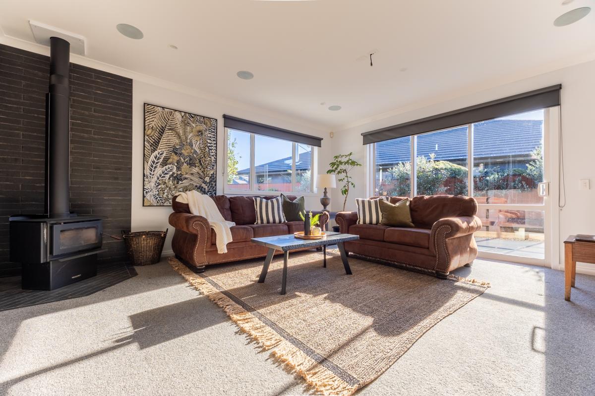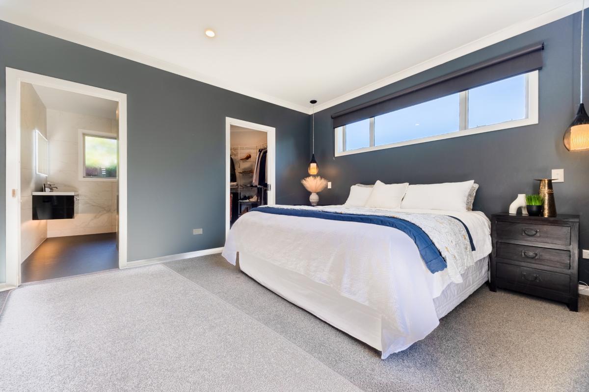 Four bedrooms and two design-led bathrooms occupy a separate wing. Floor-to-ceiling tiling, matte black detailing, and a dark feature wall elevate the spaces beyond expectation. The master suite connects directly to the deck and includes extensive wardrobe storage.