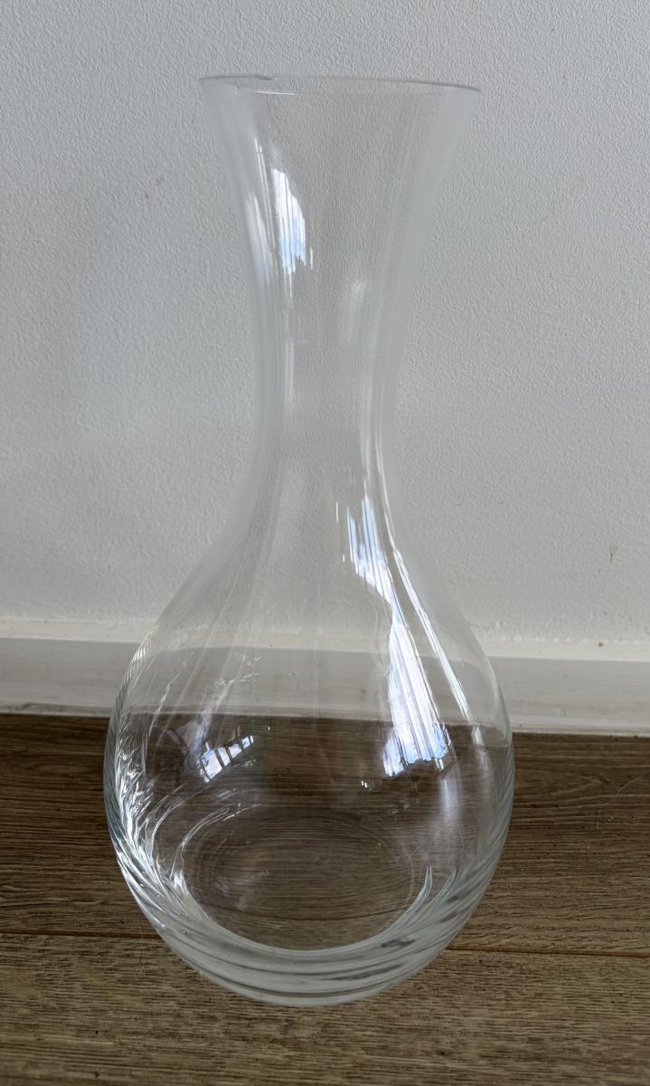 Simple, elegant glass carafe suitable for wine, water, or flowers.