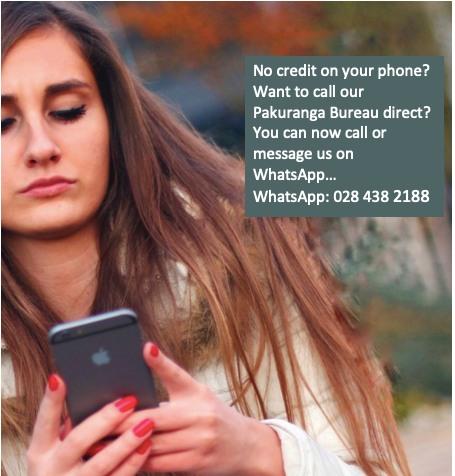 You can call or message our Pakuranga Bureau direct on WhatsApp. Add us to your Contacts now: Pakuranga CAB WhatsApp: 028 438 2188