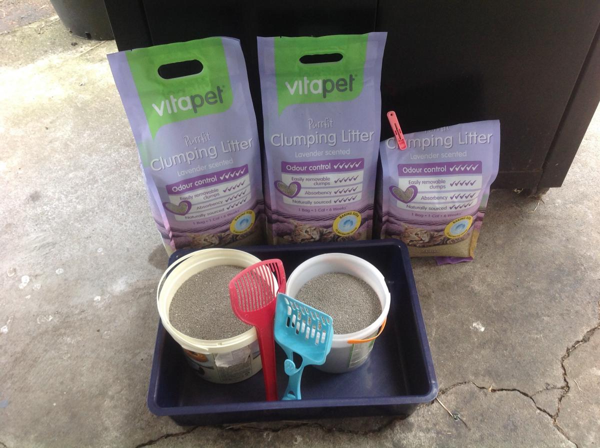 Extra cat litter and tray.