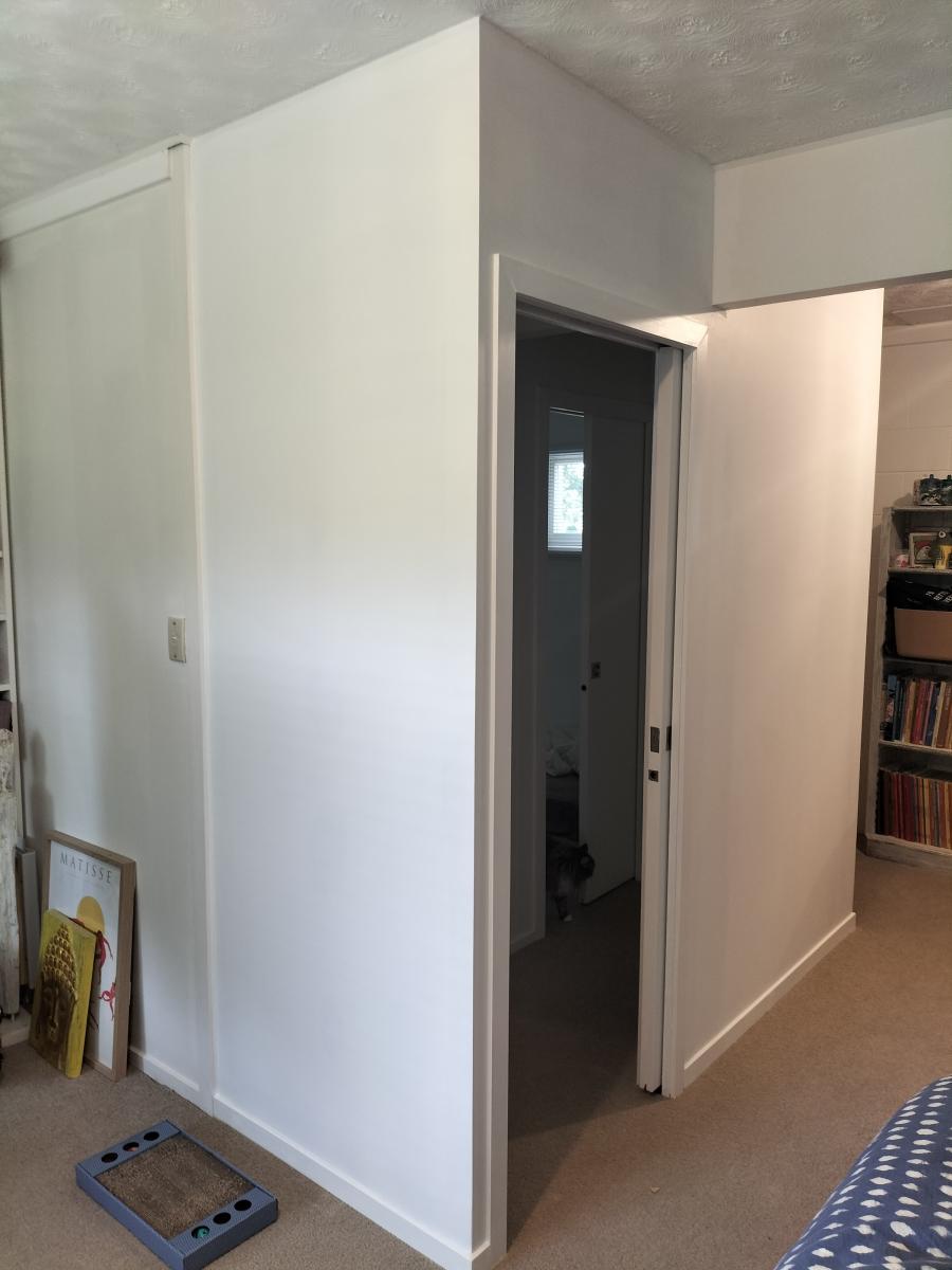 Pictures are all on the same job. The 1st 2 are of a frame with a cavity slider installed to give privacy to the Master Bedroom. The 2nd is the same walls finished.