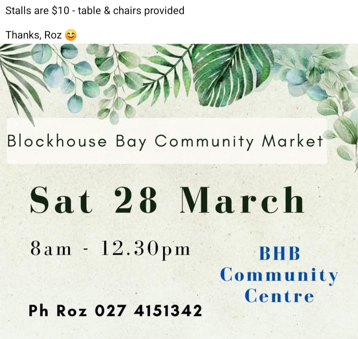 COME AND VISIT THE BLOCKHOUSE BAY COMMUNITY MARKET THIS SATURDAY MORNING, GREAT VARIETY, SUPPORT LOCAL PEOPLE, BUY NZ MADE, FIND A BARGAIN! PARKING AVAILABLE OPPOSITE AT THE MEDICAL CENTRE OR BEHIND COMMUNITY CENTRE ITSELF ETC! HOPE TO SEE YOU THERE!