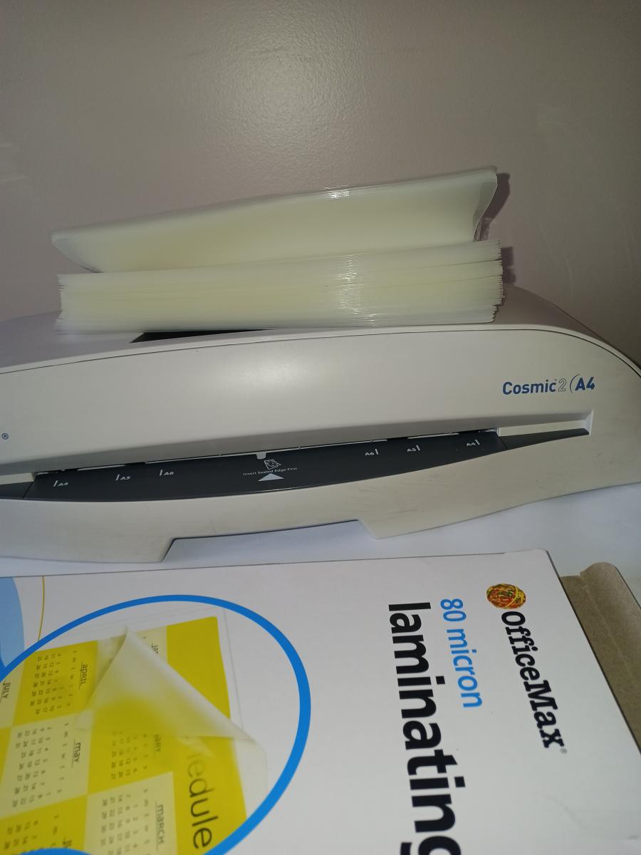 Fellows Cosmic 2 (A4) Laminating machine and Office max A4 pouches. Machine hardly get used.