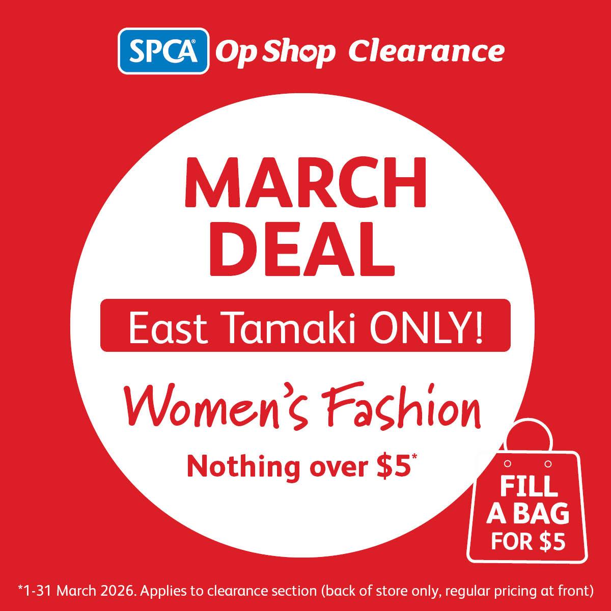 💥 All women’s fashion nothing over $5 — available in in back of shop only (excludes front of shop) from 1-31 March 2026