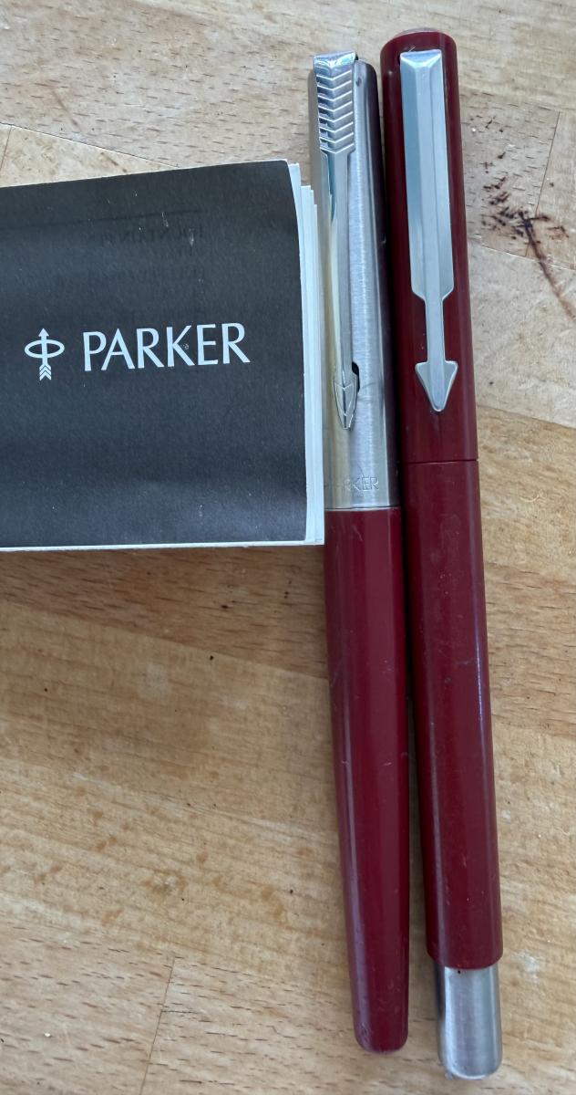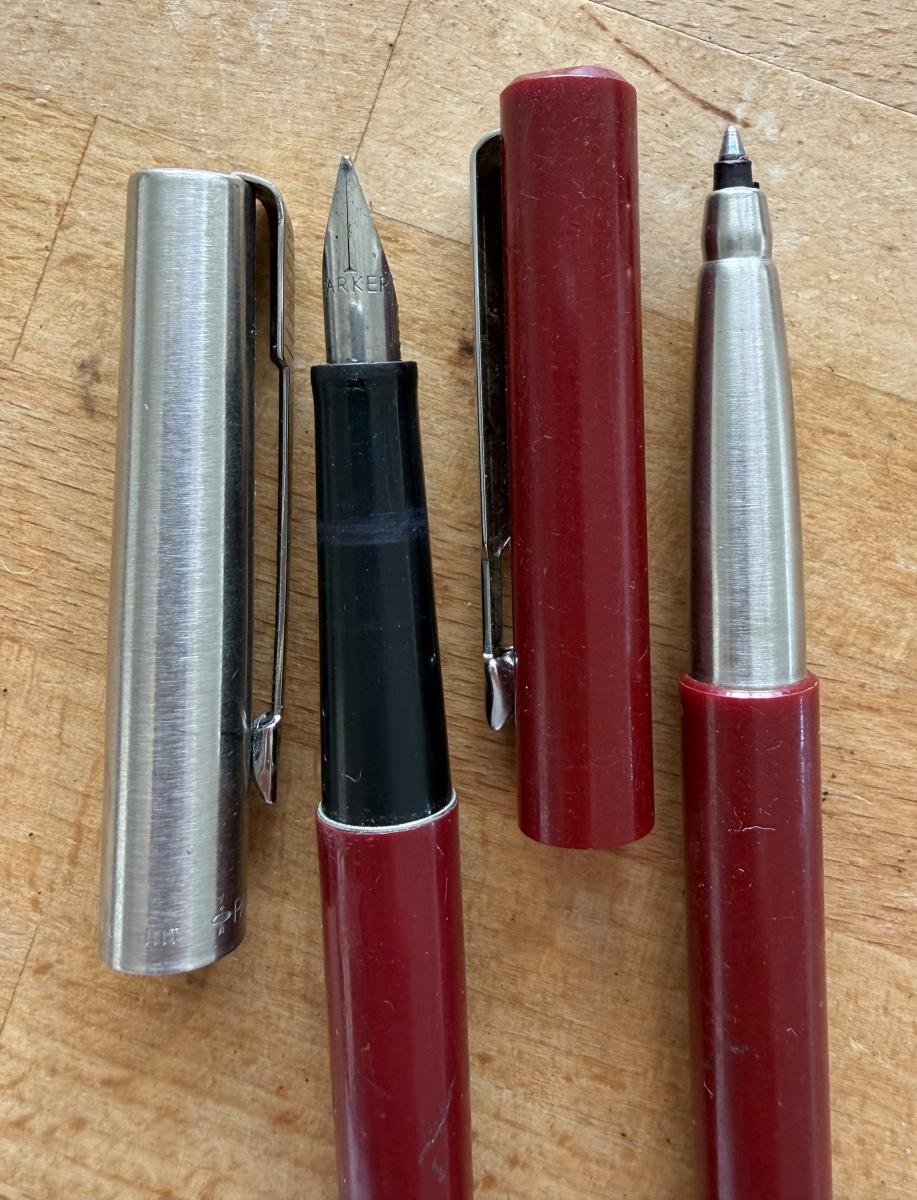 Classic red barrel with stainless‑steel caps — a collectible Parker style.