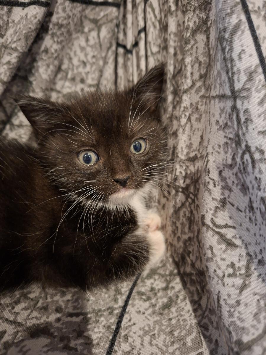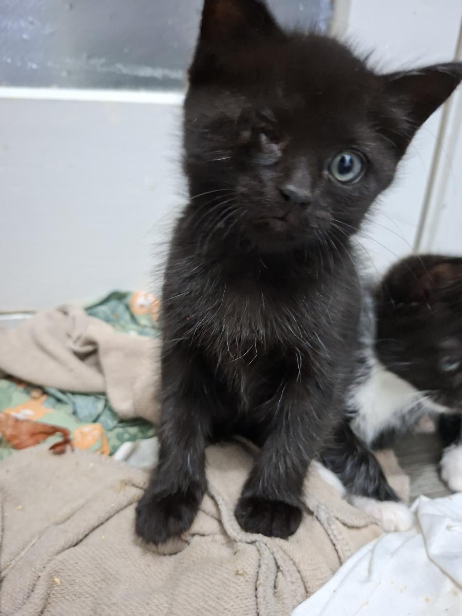 2. Male black kitten who has had an eye injury very young and lost his right eye but this doesn't hold him back, he's super playful and curious and has been around kids and is used to human touch.