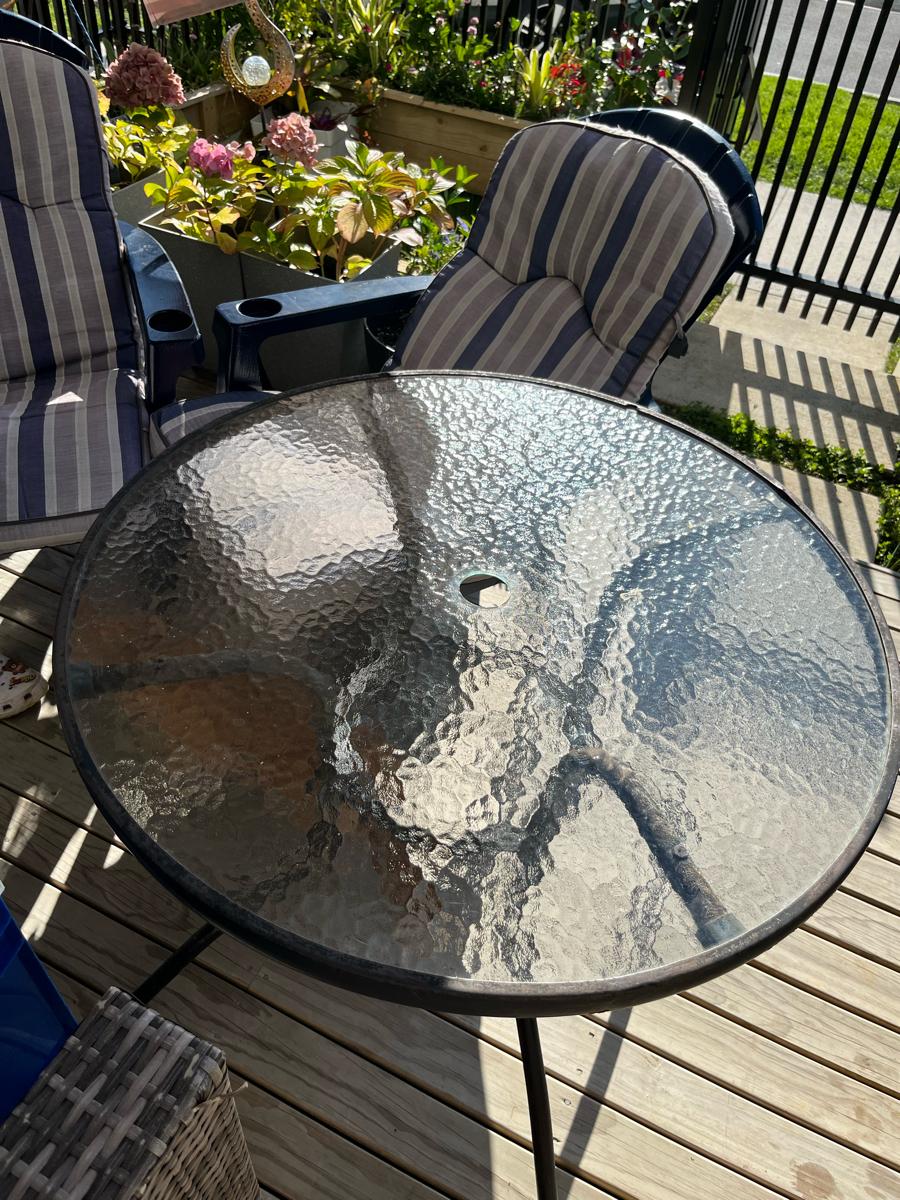 Outdoor round glass table. Glass is in perfect condition. The frame is a little old. Pick up is Flat Bush