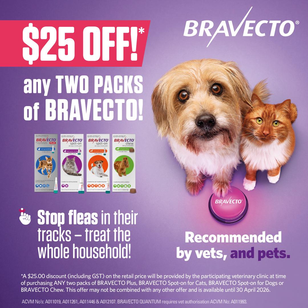 Purchase any 2 packs of Bravecto (you can mix & match!) and receive a $25 discount 🥳