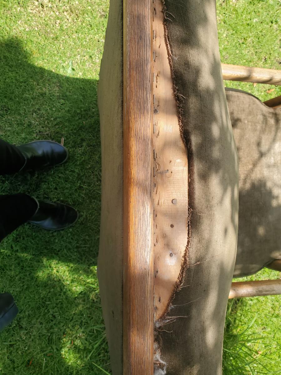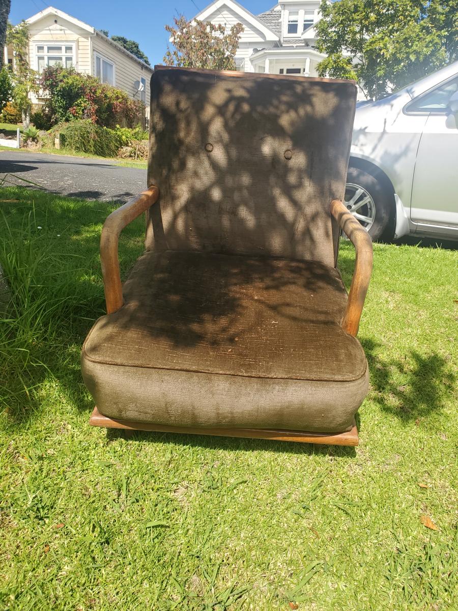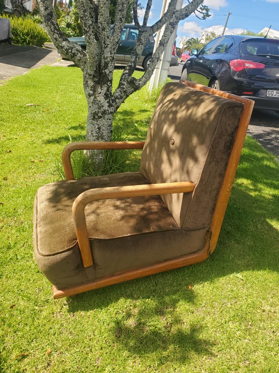 Solid and very well made wooden chair, needs some repairs. On the grass verge if anyone wants a project.