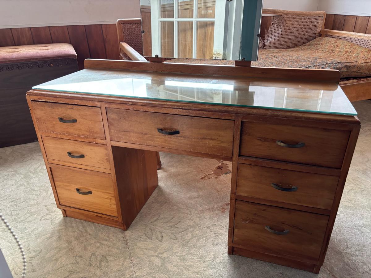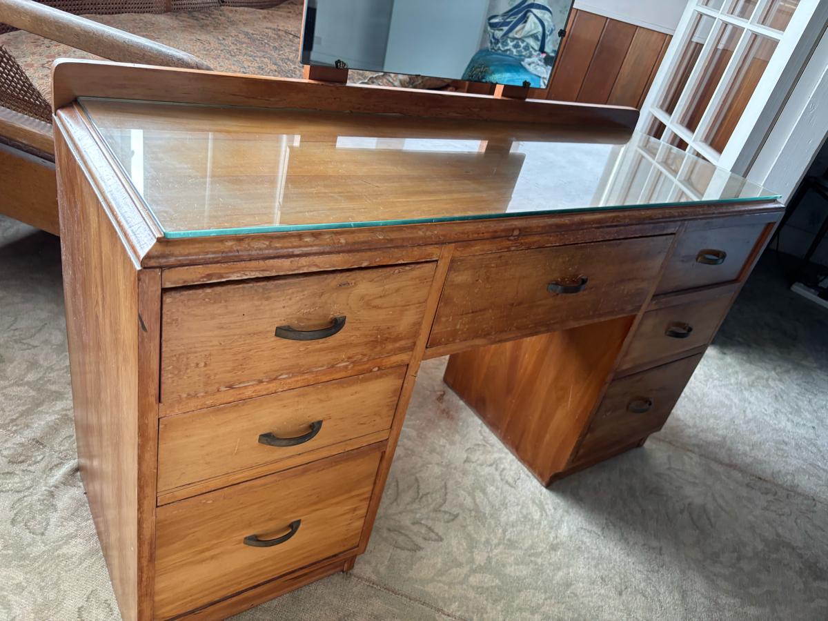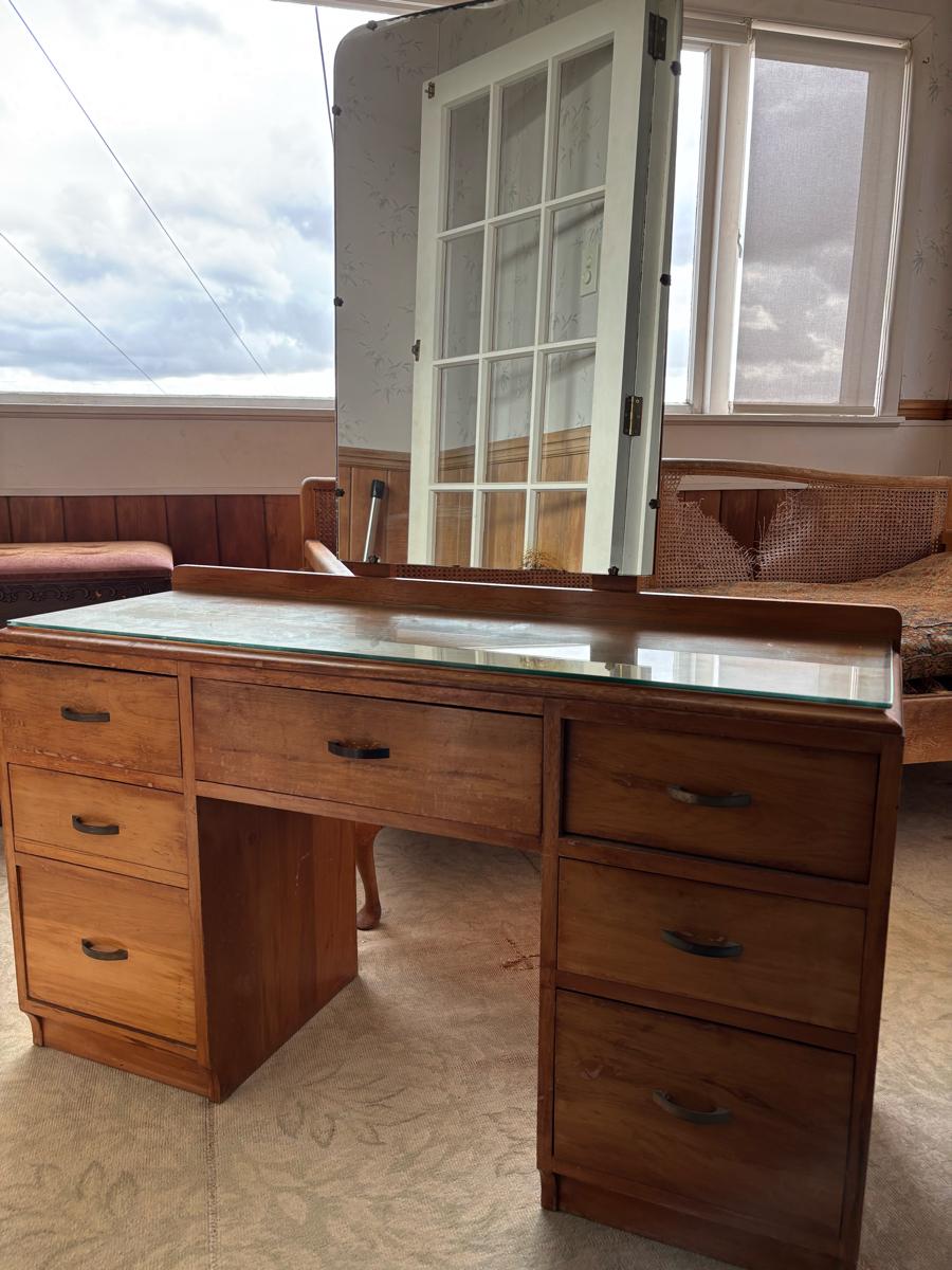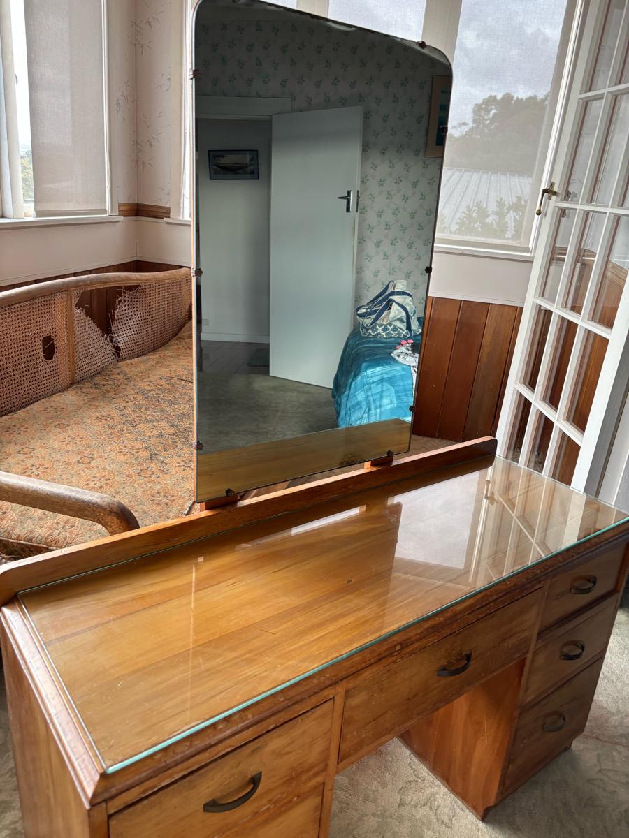 Free dressing table 114cm long , 40cm deep, 63cm height it has a 51x77cm mirror. The table top comes with a loose glass top . Send a message if interested, must pick up from here. It’s about 50 years old