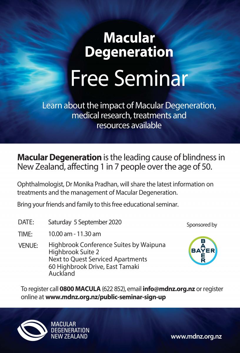 Learn about NZ's leading cause of blindness, macular degeneration at this free seminar. Local ophthalmologist, Dr Monika Pradhan will share the latest information on treatments and management of MD.