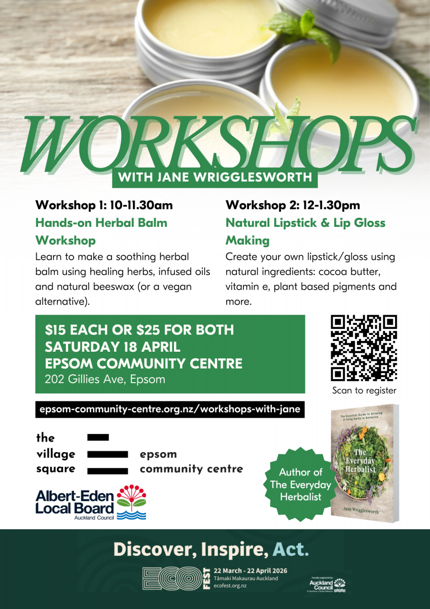These workshops are brought to you by Epsom Community Centre as part of EcoFest 2026. Supported by the Albert-Eden Local Board.