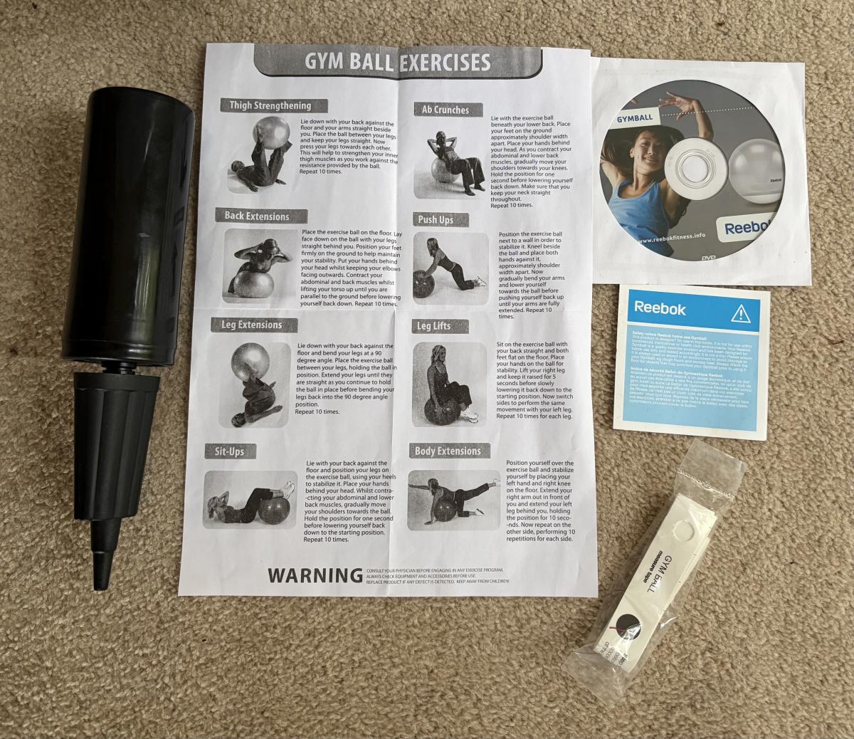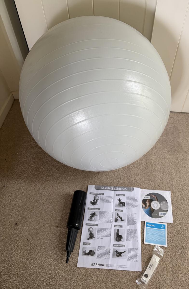 Brand new 65 cm gym ball set with pump, DVD, and exercise guide.