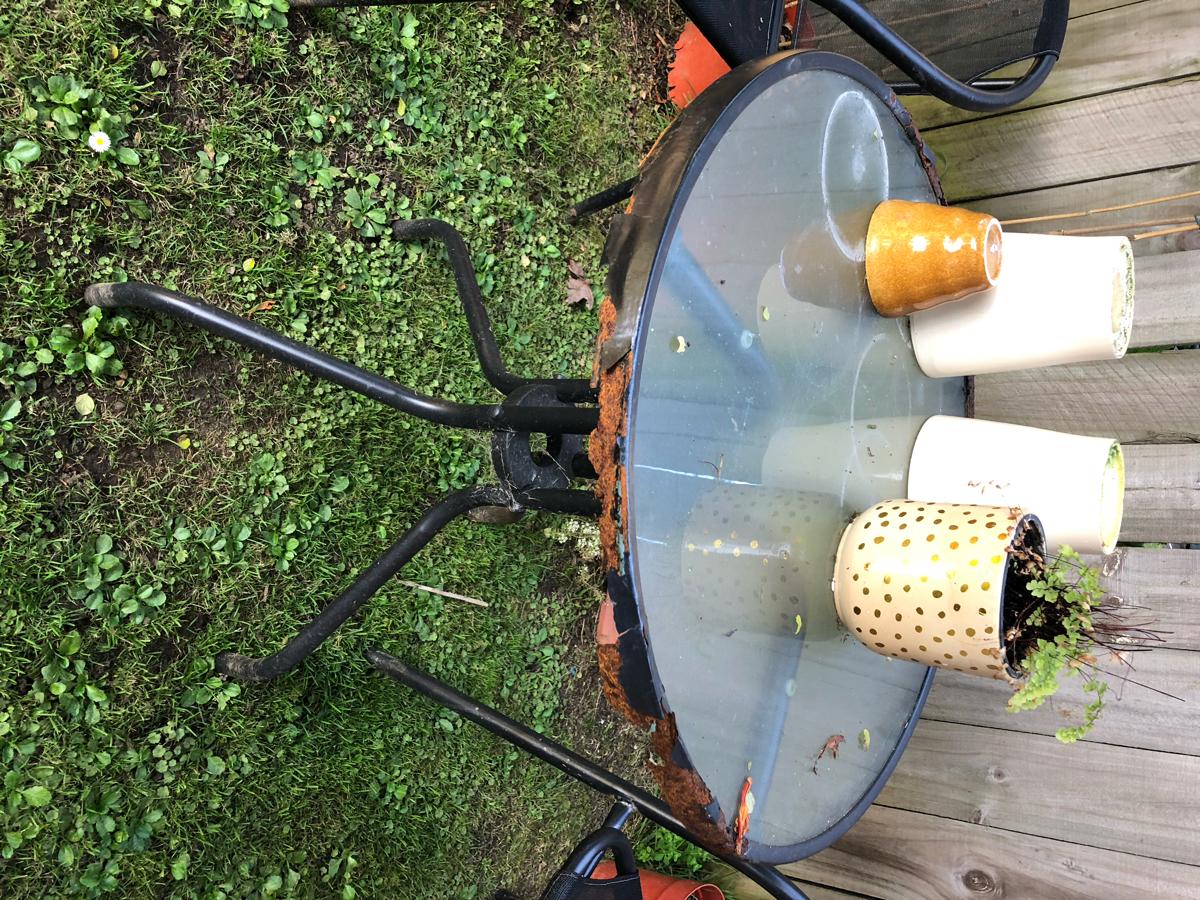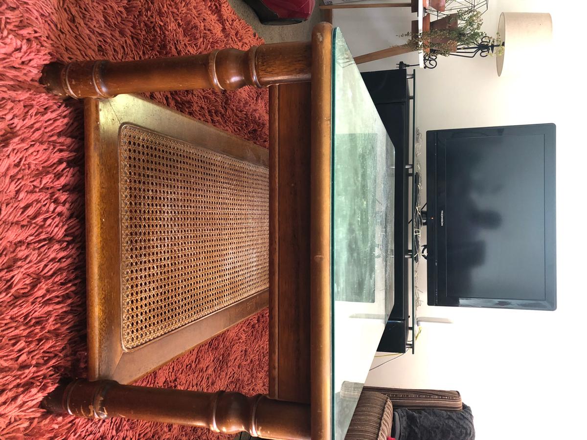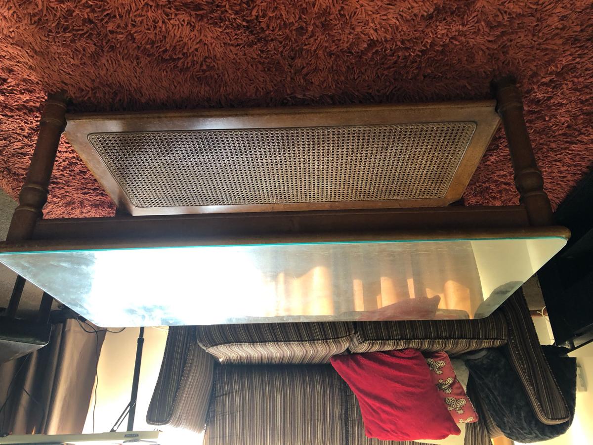 Sturdy wooden table with glass on top as we are moving out.