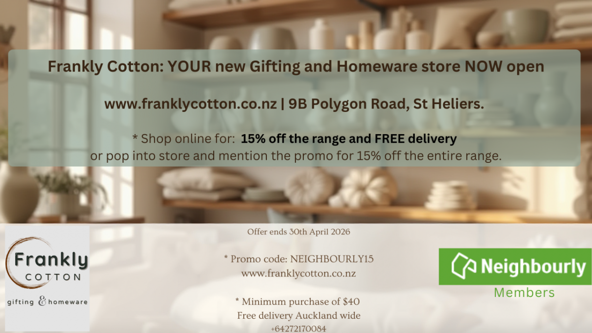 ✨Or shop online with discount code NEIGHBOURLY15 for FREE delivery Auckland wide when you purchase $40 or more. To celebrate our local community, Frankly Cotton is giving 15% OFF to all Neighbourly members.