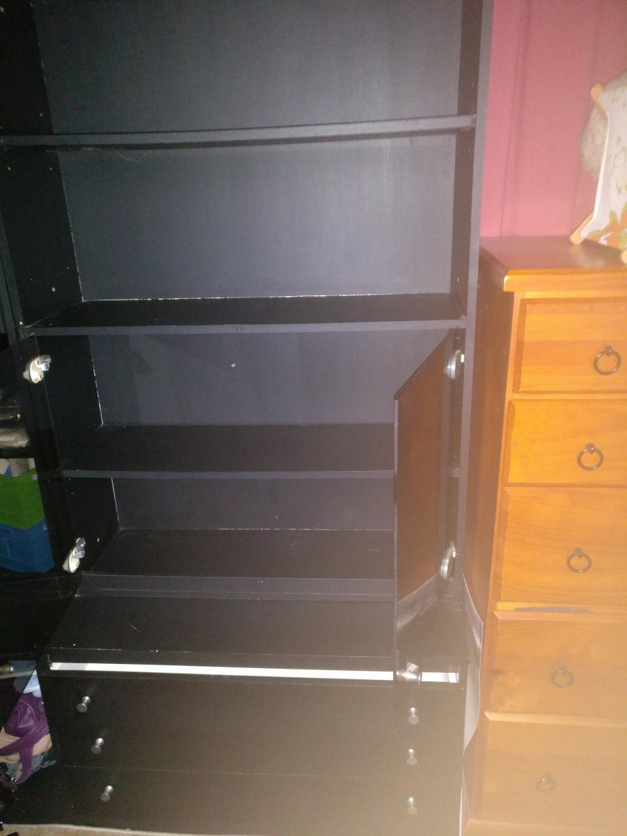 Shelvings. I think this is a two piece set, a top and a bottom. It is in overall used but still in good condition. These are very useful. The cupboard on one side and the two-door one in the centre has a shelving each. It has four drawers on the side. … View more$120.00