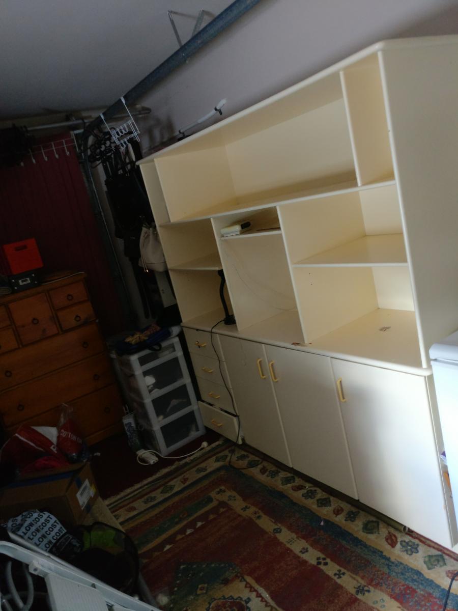 Shelvings. I think this is a two piece set, a top and a bottom. It is in overall used but still in good condition. These are very useful. The cupboard on one side and the two-door one in the centre has a shelving each. It has four drawers on the side. There are several shelves in the top piece. The edges are rounded so look very neat. Am reluctant to sell but have no choice due to insufficient space. Note that this is a retro piece of furniture so is very well made.
