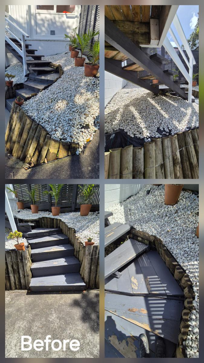 After our brilliant clients hand dug away a large portion of the existing retained dirt bank under the stairs themselves 🙏 We installed a new fit for purpose retaining wall, custom made treated stairs and a mid level concrete landing. New entrance access achieved. 👍