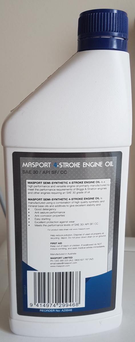 Masport Semi-Synthetic 4-Stroke Oil is a high performance and versatile engine oil primarily manufactured to meet the performance requirements of Briggs & Stratton engines and other engines requiring an SAE 30 grade of oil. Masport Semi-Synthetic 4-Stroke engine oil is manufactured using a combination of high quality synthetic and mineral base oils and additives to give excellent stability.