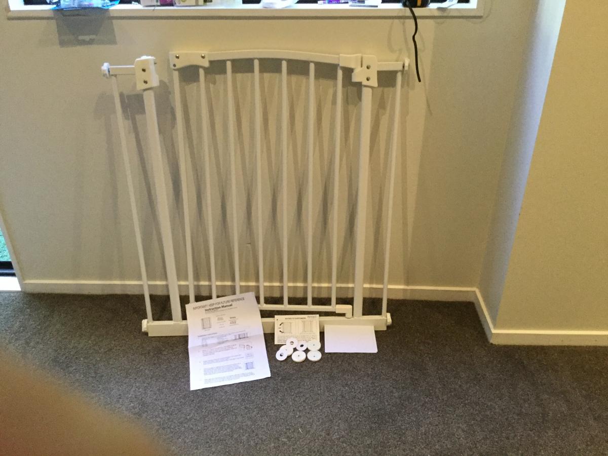 White standard size safety gate bought a few months ago for puppy no longer needed.
