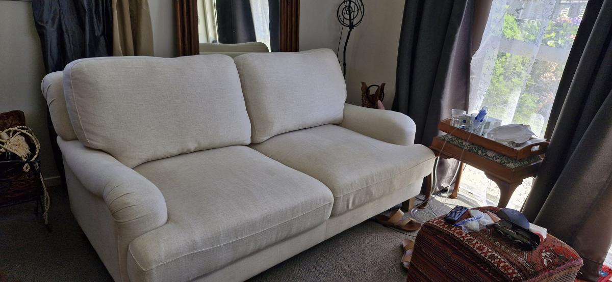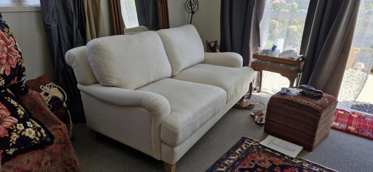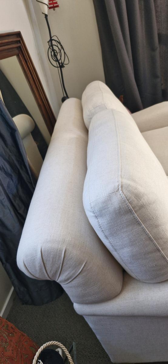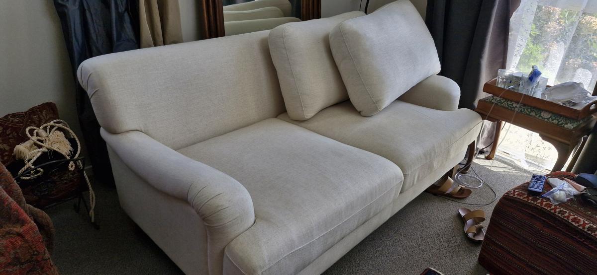 2 seater settee, linen cIr. Small stain as in Pic else in excellent condition. No tears in upholstery 173Lx105wx80d