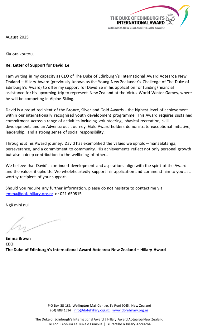 Every contribution makes a meaningful difference. Additionally, it would be greatly appreciated if you could simply share my page, as your support helps me stay on the slopes, refine my skills, and pursue excellence on the international stage. If you know of any sponsors who may be able to provide support, I would be grateful if you could connect me with them at davidee@outlook.co.nz.