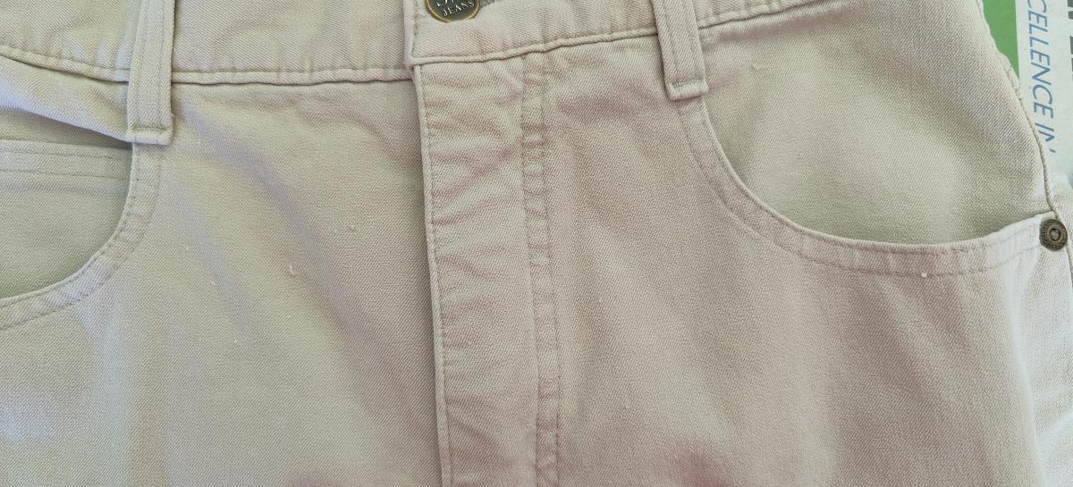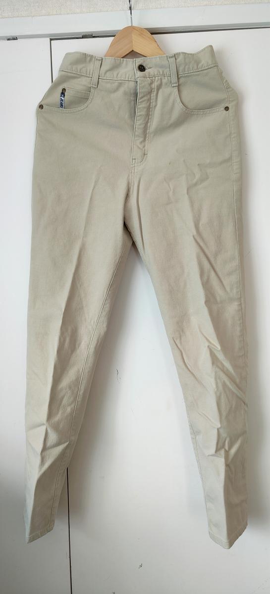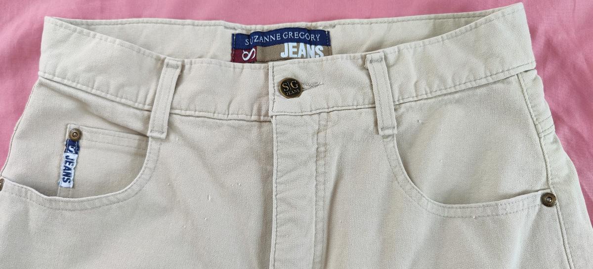 One… View moreSmart, high-waisted Suzanne Gregory cotton/Lycra jeans in a classic neutral, sand-coloured cotton. These jeans feature a zip fly, front and back pockets, and a straight leg cut. Perfect for casual days out or dressing up with a stylish top and heels!