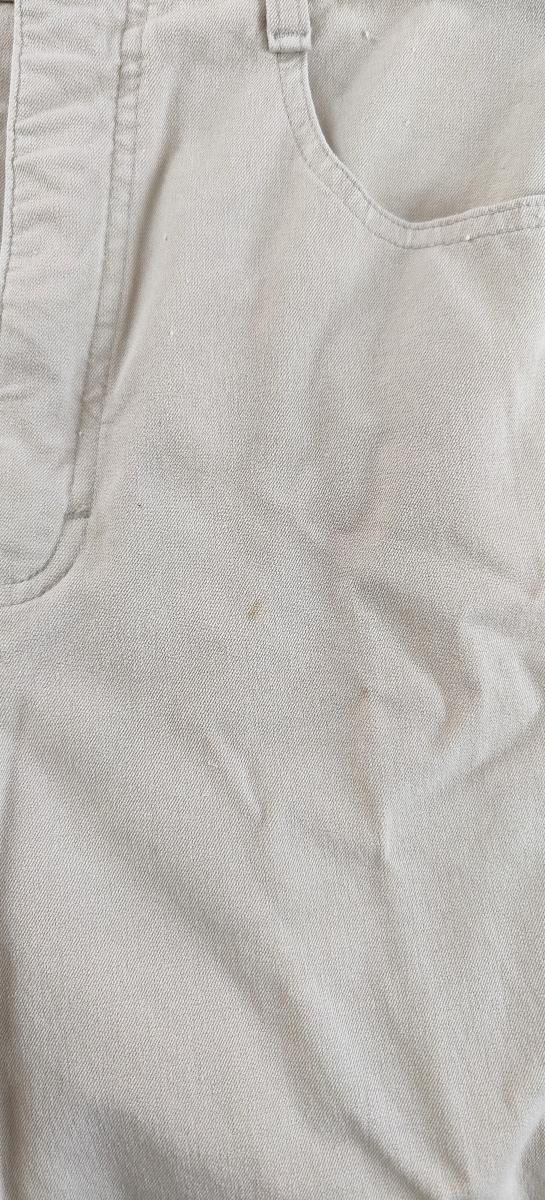 One small stain on the front leg adjacent to the fly; some fabric pulls over the stomach area (you have to look close to see these!) - please see last two photos.