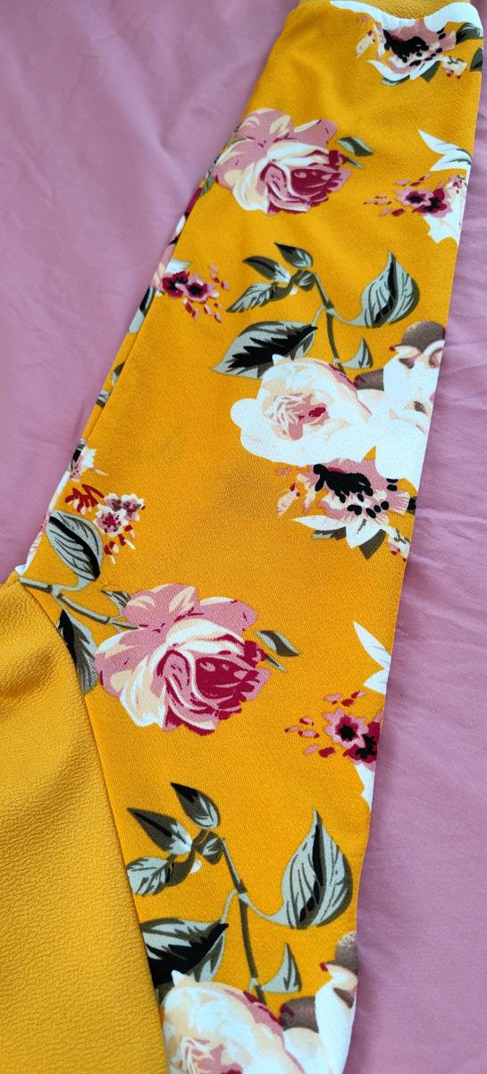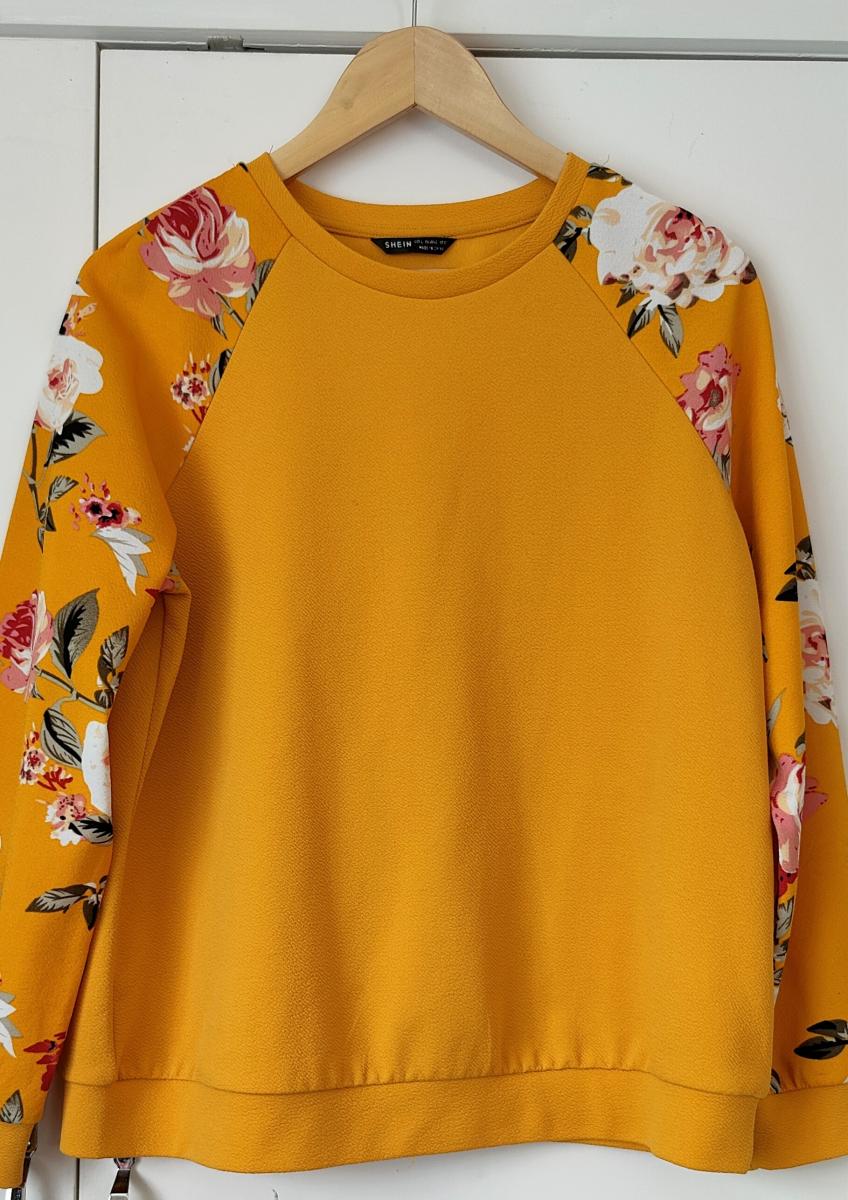 This lightweight sweatshirt features an unusual crinkle-patterned, yellow fabric for the body, with sleeves in a pretty floral - please see close-up photo for this detail.