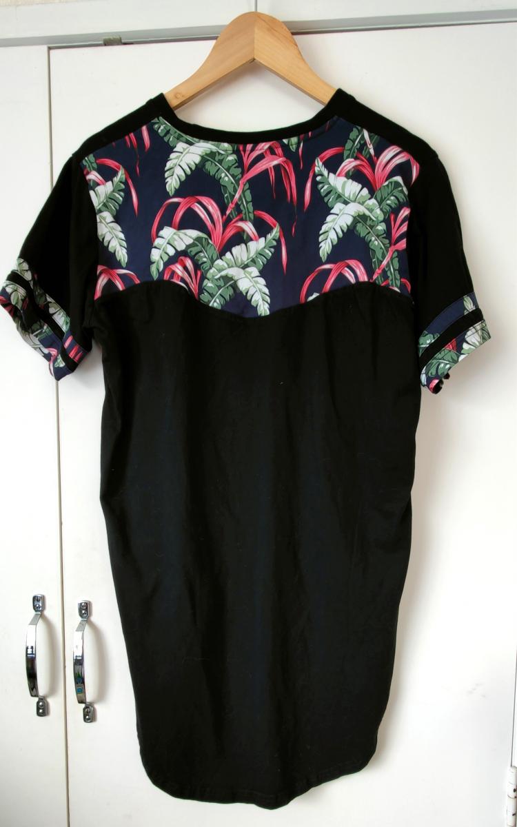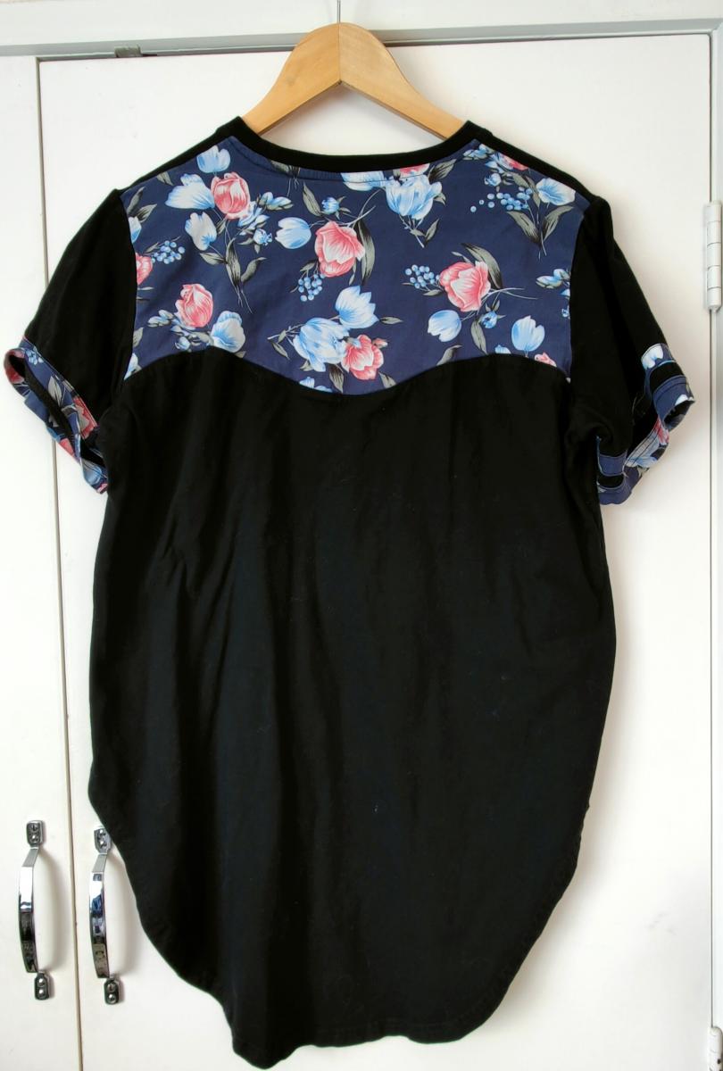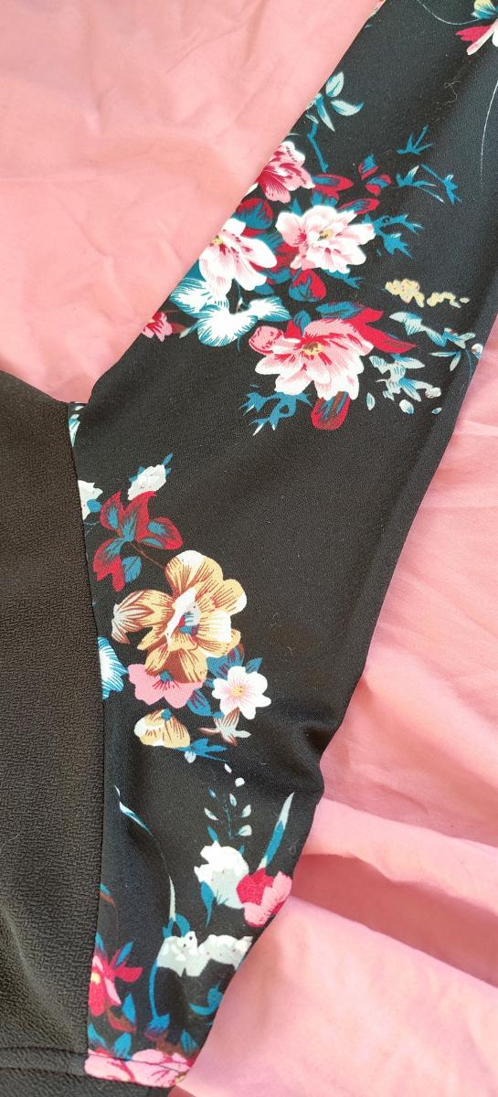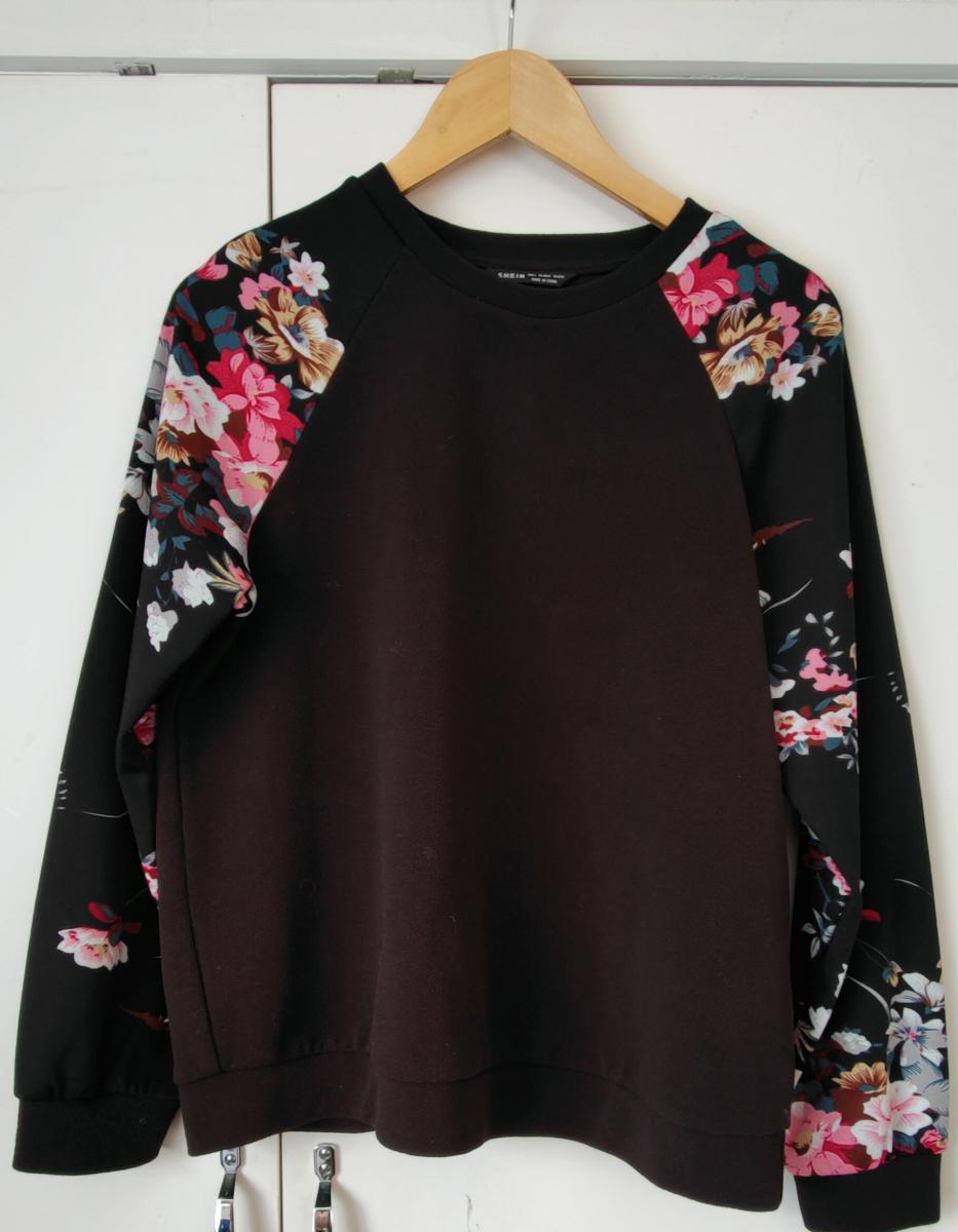 This lightweight sweatshirt features an unusual crinkle-patterned, black fabric for the body, with sleeves in a pretty floral - please see close-up photo for this detail.