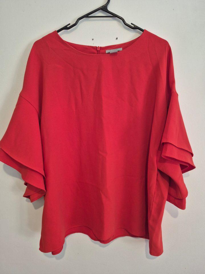 Features pretty double-flutter sleeves; quality polyester fabric, nicely made. In excellent condition.