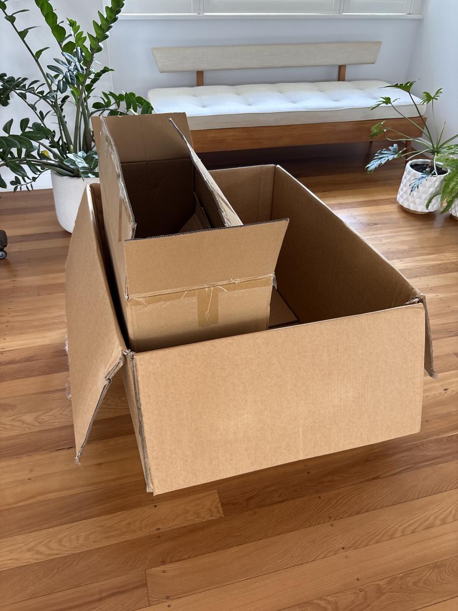 No lights/ornaments—just the tree in sections + big original box.
