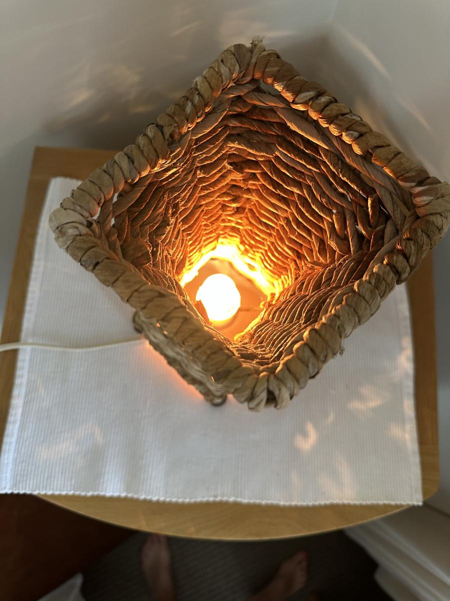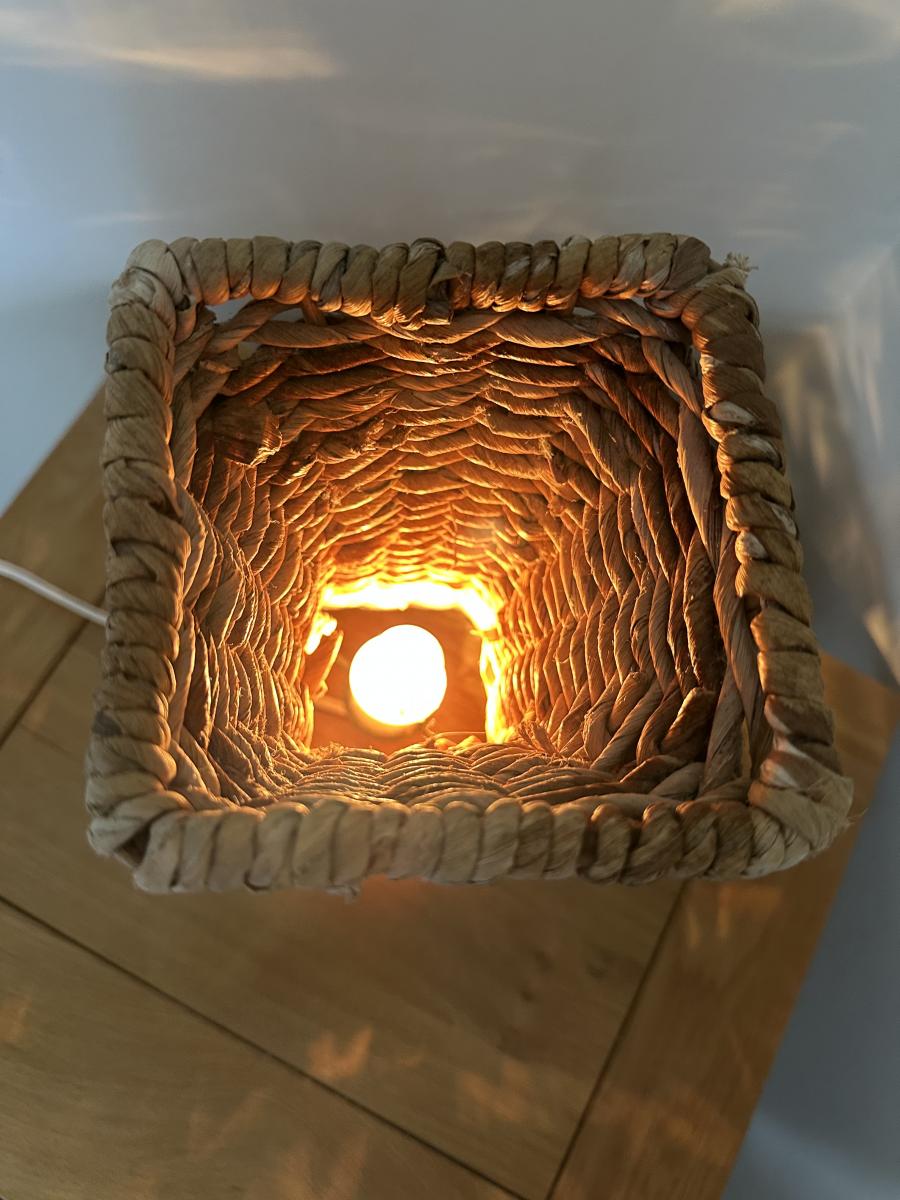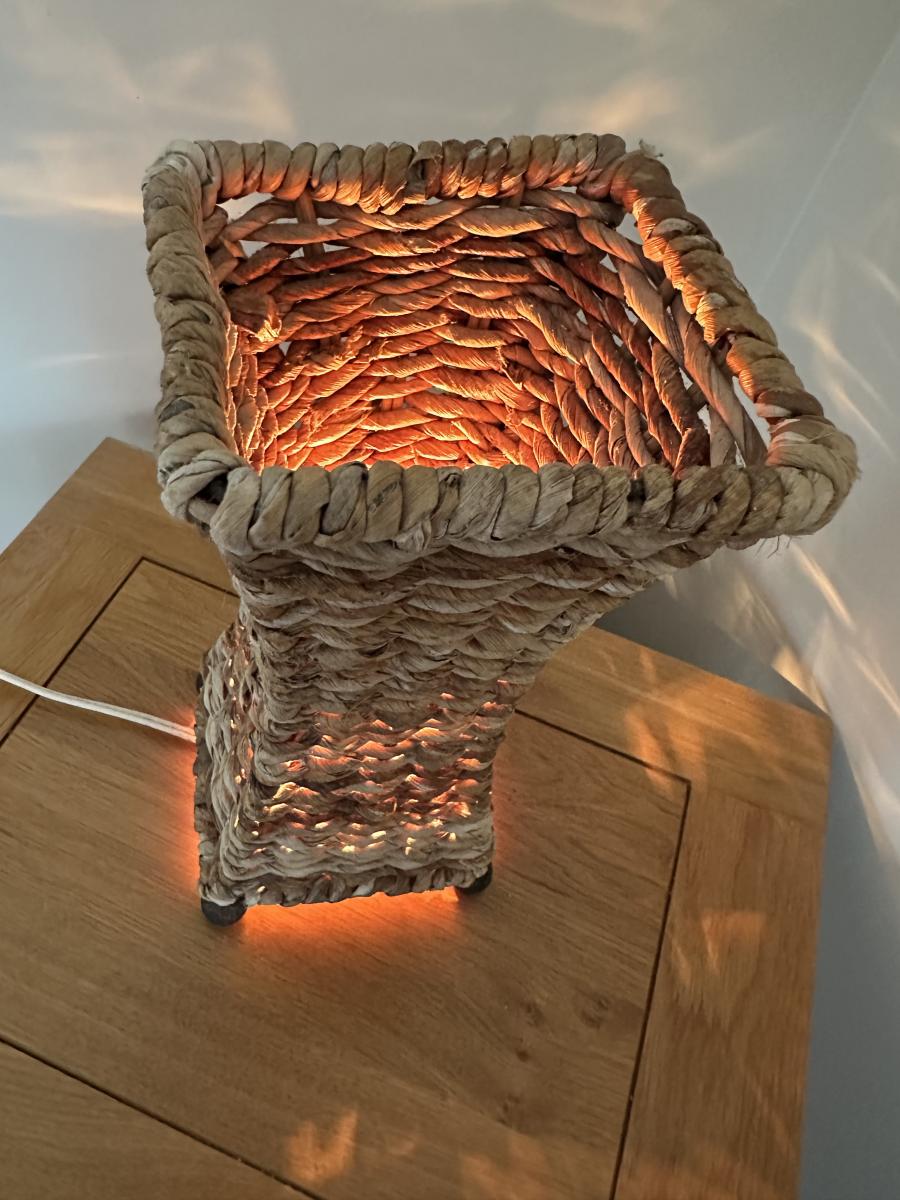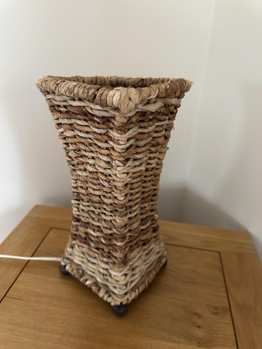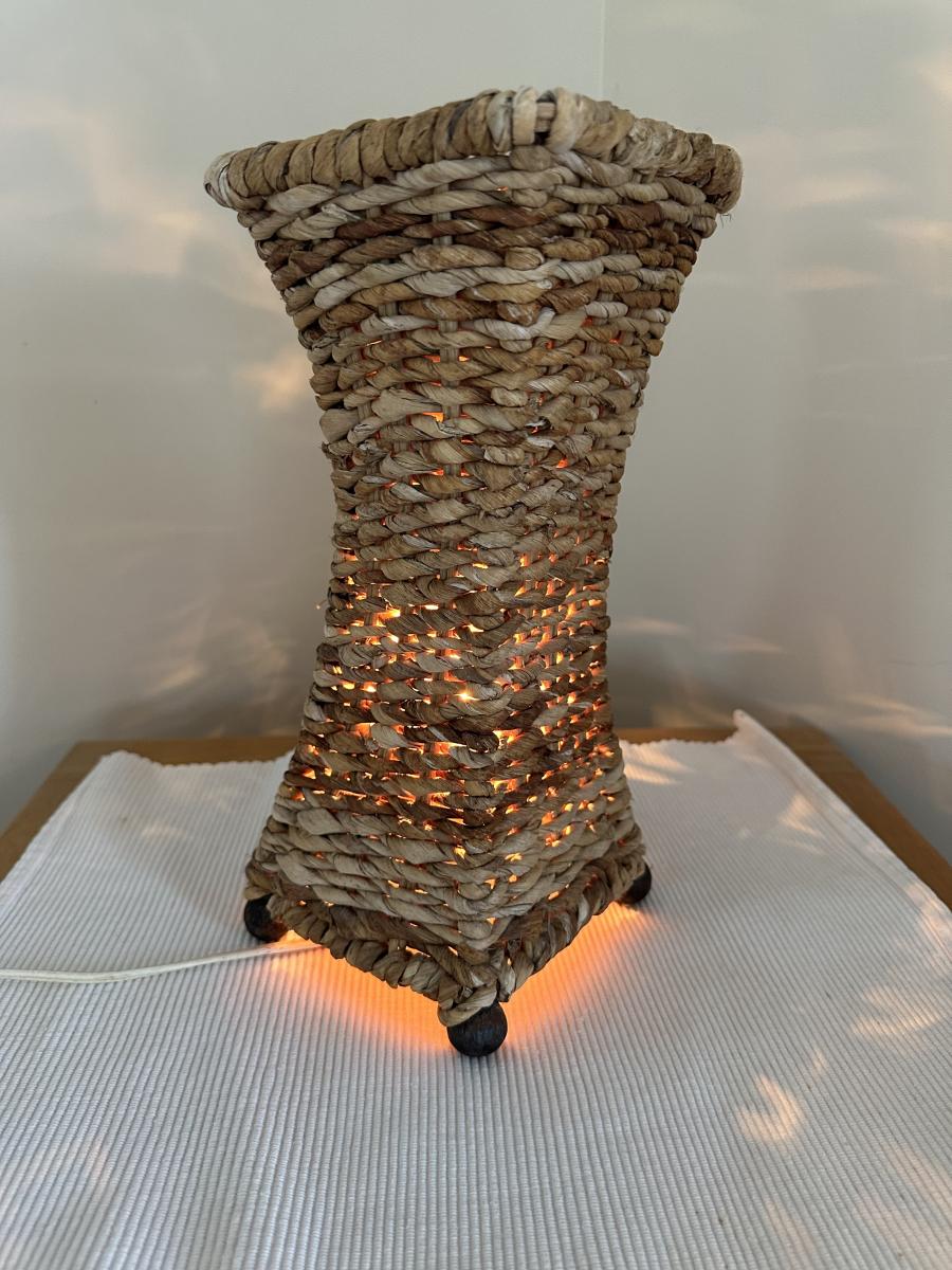 Lovely Cane basket weave or wicker table lamp. Nice glow is given off with candle bulb (included)