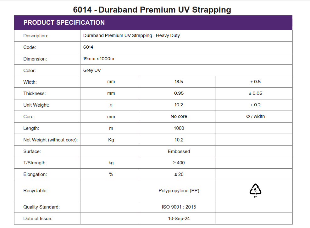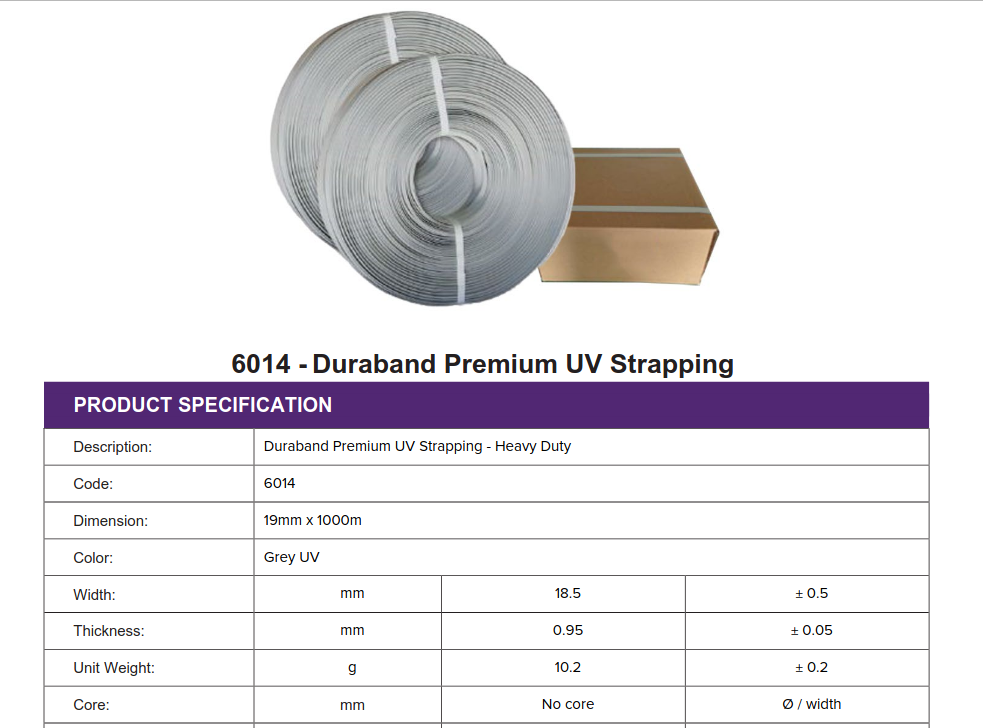 Polypropylene Strapping is a well known premium grade strap. Duraband Premium Strapping is UV resistant and super strong, designed for outdoor applications.