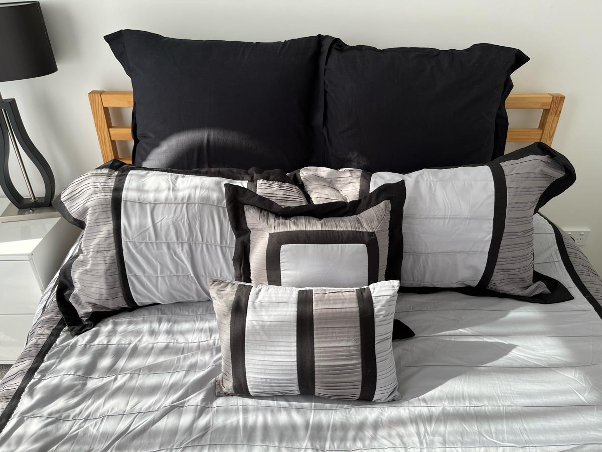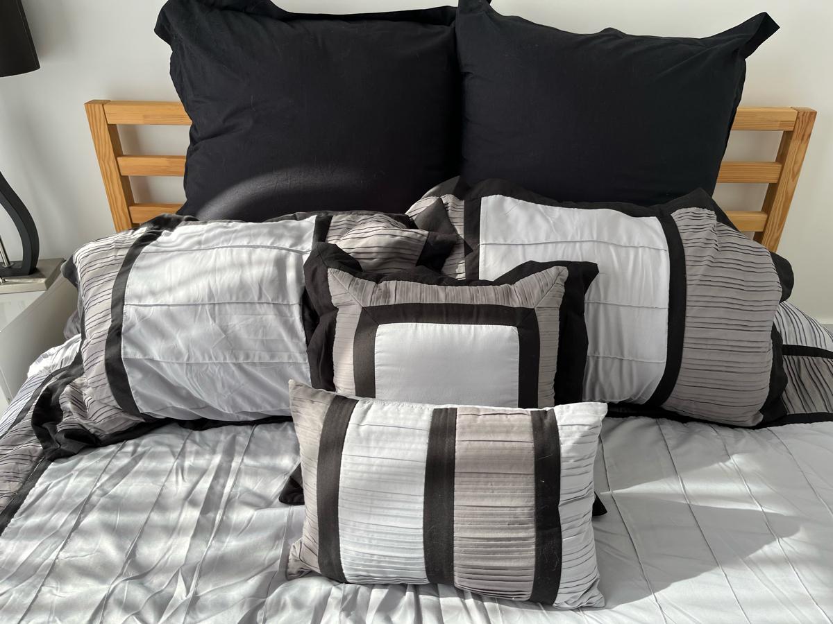 5 piece queen size reversible comforter set. Other side is plain black. Brand new. Have never used it. Consists of: