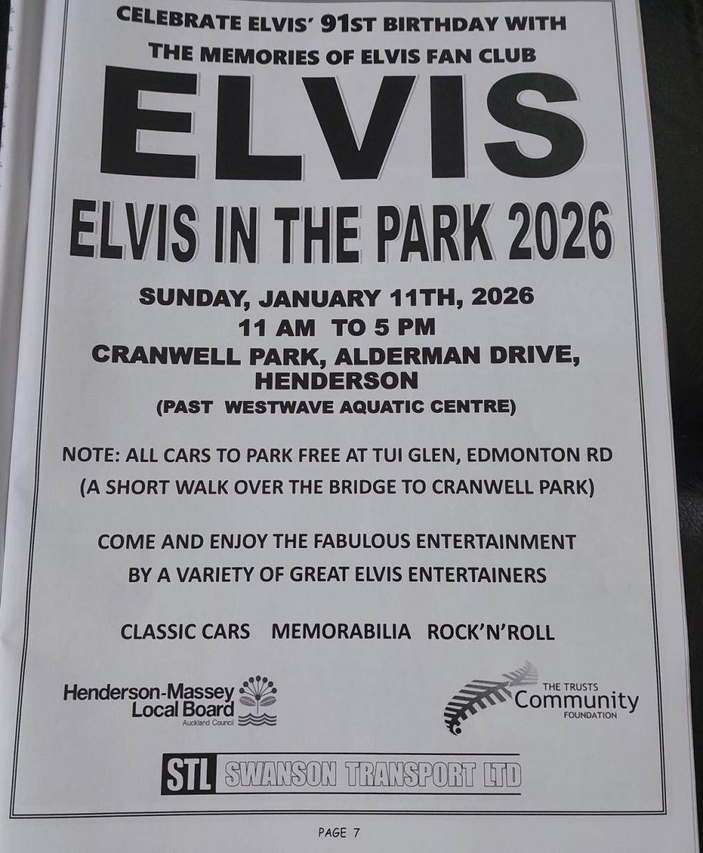 Elvis in the Park. 11th January from 11am till 5pm. Cranwell Park in Henderson. Free Family day out. Check out the Classic Cars and Hot Rods. Bring your chairs, sun tan lotion, water, and your smile. We are celebrating Elvis' 91st Birthday. Any questions ph Jackie 0274901126. Park at Tui Glen as easy walk over bridge to Cranwell Park